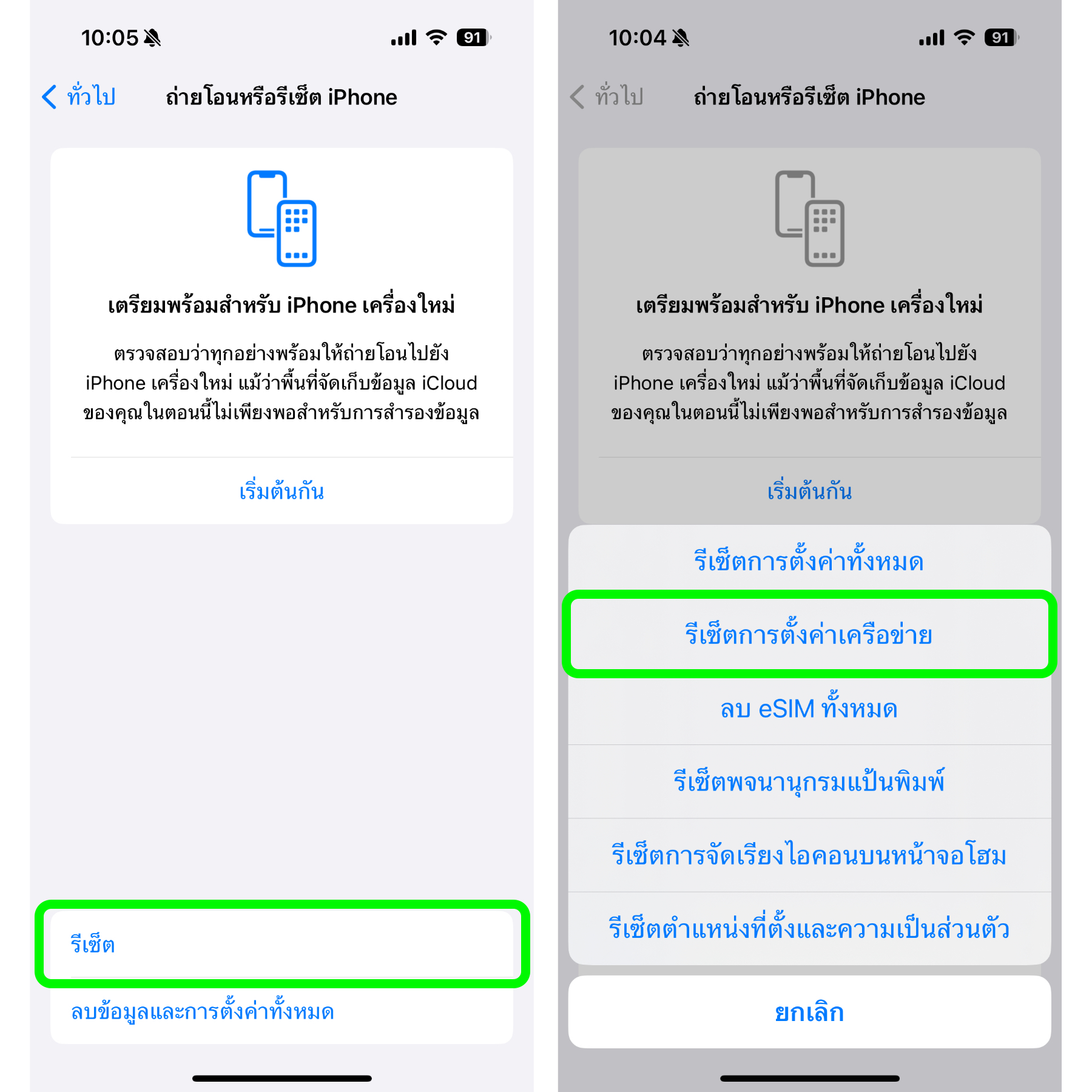 ไปที่ การตั้งค่า (Setting) > ทั่วไป (General) > ถ่ายโอนหรือรีเซ็ต iPhone (Transfer or Reset iPhone) > รีเซ็ต (Reset) > รีเซ็ตการตั้งค่าเครือข่าย (Reset Network Settings) > กรอกรหัสและแตะเลือก รีเซ็ทการตั้งค่าเครือข่าย