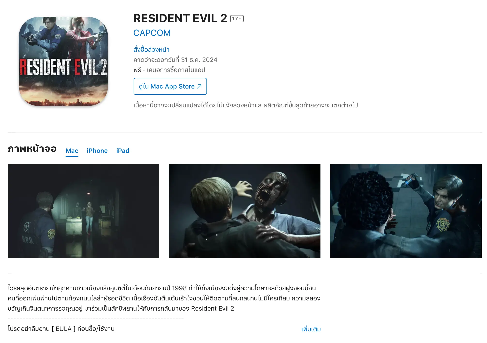 ก่อนหน้านี้ CAPCOM ได้ปล่อยเกม Resident Evil Village, Resident Evil 7 และ Resident Evil 4 ให้ผู้ใช้ iPhone, iPad, Mac ได้เล่นแล้ว และล่าสุดก็ได้มีกำหนดการเปิด Resident Evil 2 แล้วว่าจะเปิดให้เล่นวันที่ 31 ธ.ค. 2024