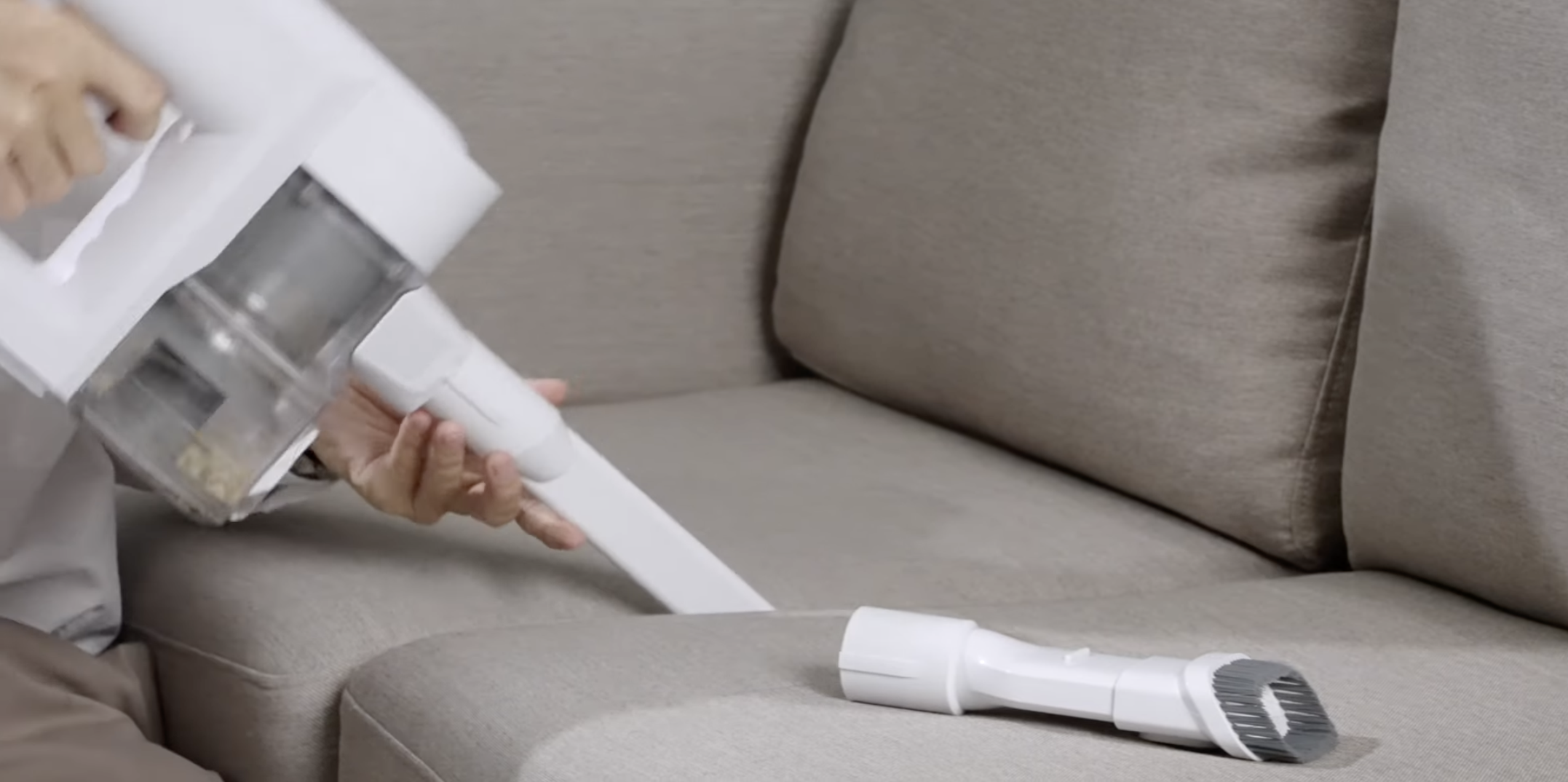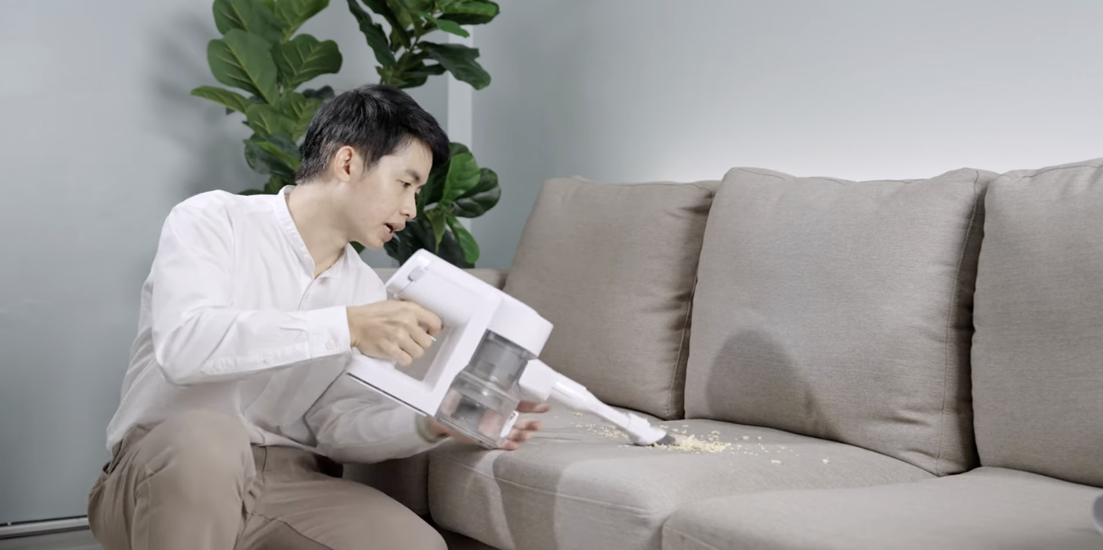 สำหรับการทำความสะอาดบนโซฟาเราได้ลองใช้หัวที่มีมาให้หลายรูปแบบผสมกับ เริ่มจากการดูดเศษอาหารชิ้นใหญ่ด้วยหัวแปรงแบบ 2 in 1 จากนั้นใช้หัวแปรงแบบปากแบนในการทำความสะอาดตามซอกตามมุมบริเวณที่นั่งของโซฟา และปิดท้ายด้วยหัวแปรงไฟฟ้าสำหรับดูดไรฝุ่น
