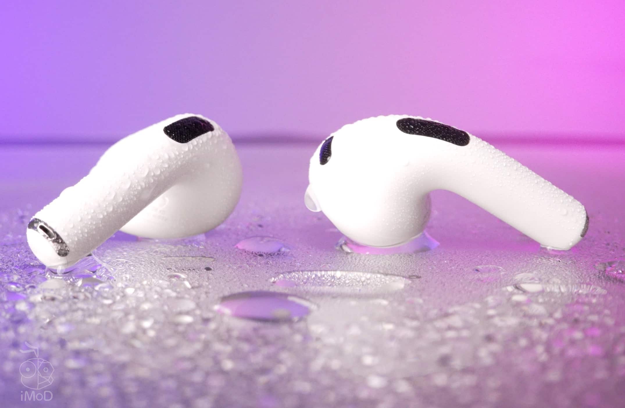 - AirPods รุ่นที่ 3 มีมาตรฐานทนน้ำ IPX4 ทั้งหูฟัง และเคสชาร์จ สามารถใส่ออกกำลังกายที่มีโอกาสถูกน้ำกระเด็นใส่ เช่น ทนเหงื่อจากการวิ่ง รวมถึงทนน้ำฝนกระเด็นใส่ขณะที่วิ่งแล้วฝนตกอยู่ได้