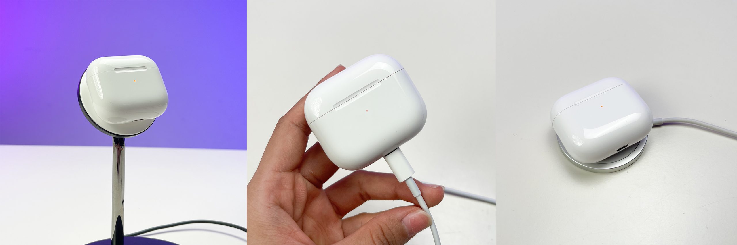 - เคสชาร์จจะมีลักษณะคล้ายกับเคสของ AirPods Pro แต่จะมีตัวเครื่องขนาดเล็กกว่า พอร์ตชาร์จช่องต่อ Lightning และยังรอบรับการชาร์จด้วย MagSafe และเครื่องชาร์จที่ได้รับการรับรองมาตรฐาน Qi