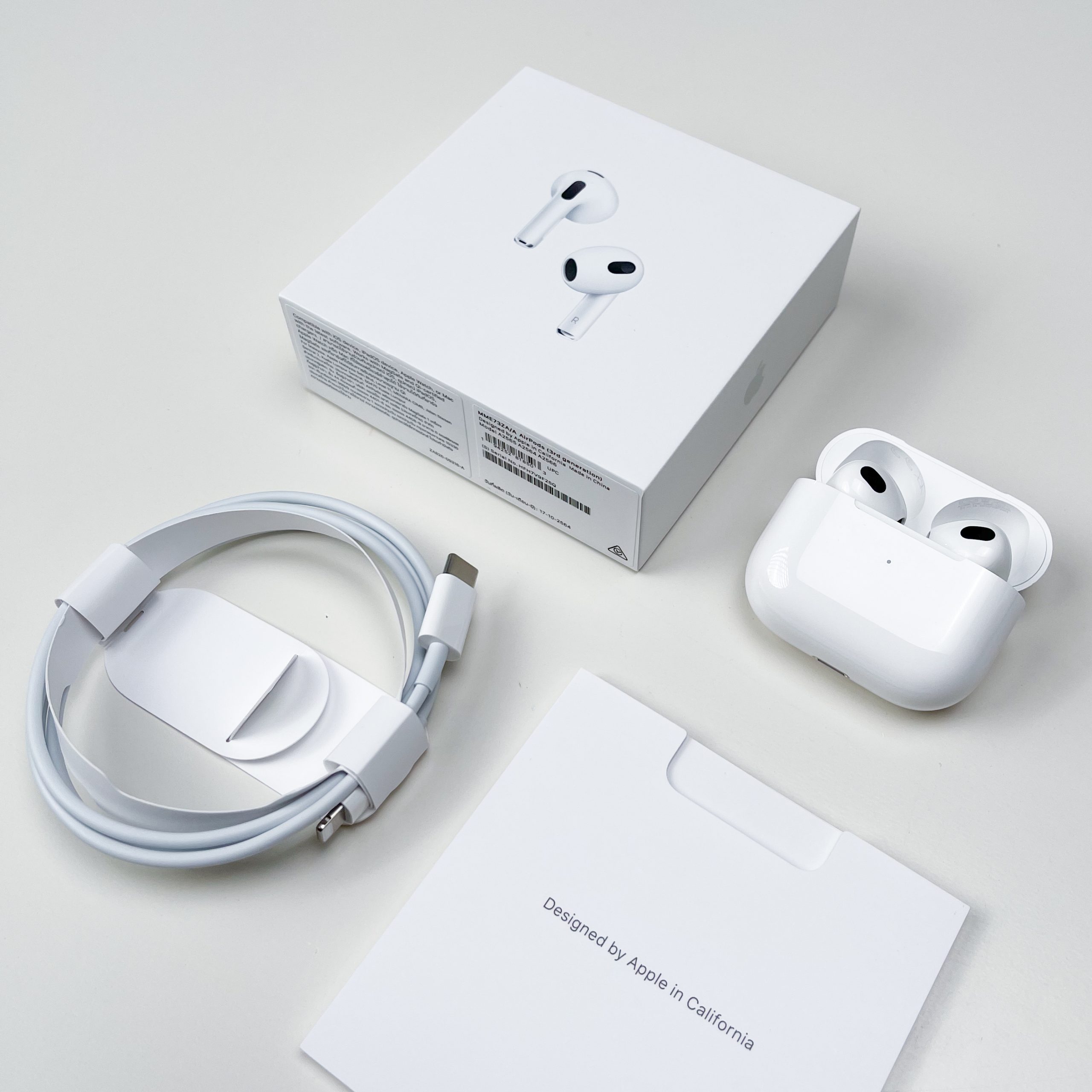 กล่องหูฟัง AirPods รุ่นที่ 3 มาในกล่องสีขาวสีเหลี่ยมจตุรัส พิมพ์นูนรูปตัวหูฟัง AirPods รุ่นที่ 3 และลดการใช้พลาสติก โดยจะเป็นการฉีกกระดาษที่ด้านหลังเพื่อเปิดบรรจุภัณฑ์ โดยในกล่องจะประกอบไปด้วย