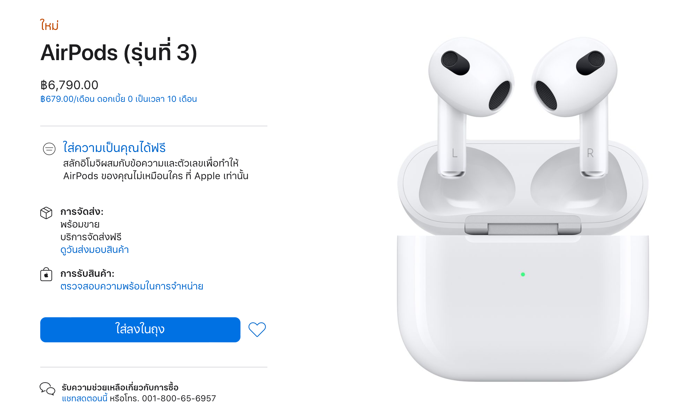 AirPods (รุ่นที่ 3) ขายราคา 6,790 บาท สั่งซื้อได้ที่ Apple Store Online, หน้าร้าน Apple Store และตัวแทนจำหน่ายทั่วประเทศ