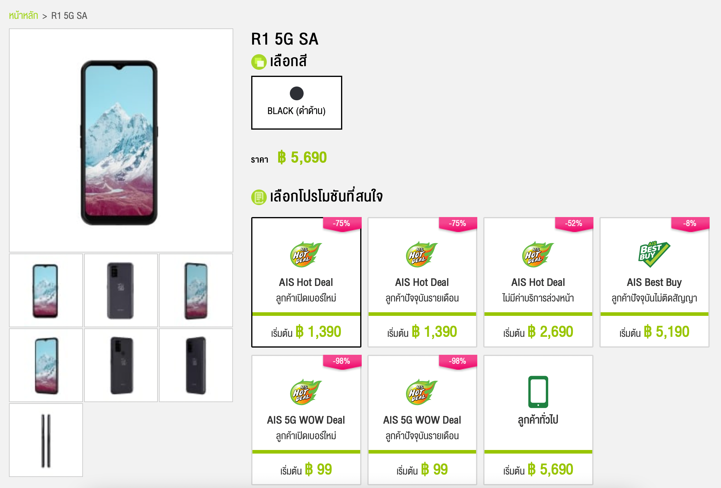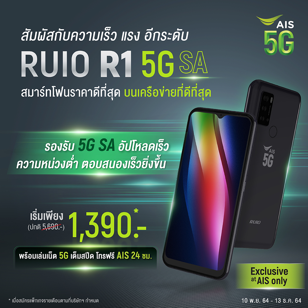 สมาร์ทโฟน RUIO R1 5G SA จำหน่ายราคา 5,690 บาท แต่เมื่อซื้อพร้อมแพ็กเกจ AIS ที่ร่วมรายการ ราคาเริ่มต้นเพียง 1,390 บาท เล่นเน็ต 5G เต็มสปีด และยังโทรฟรีในเครือข่าย AIS 24 ชม.