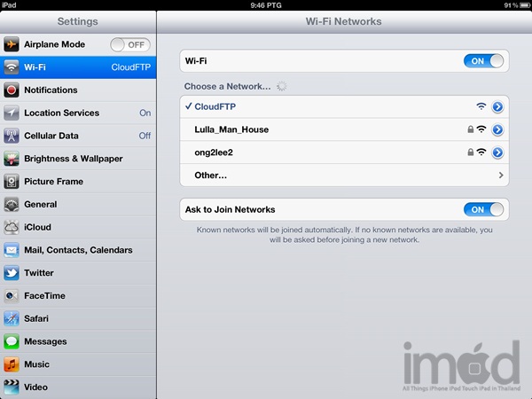 จากนั้นตั้งค่าการเชื่อมต่อระบบเครือข่ายใน iPhone, iPad ให้เชื่อมต่อกับ CloudFTP Hotspot ที่ปล่อยออกมา (ค่า default จะไม่ต้องรหัสผ่านแต่สามารถตั้งค่าภายหลังได้)