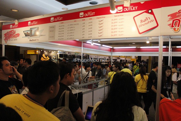 อันนี้เป็นภาพ 10 นาทีหลังจากงานเริ่มครับ คนเยอะมาก ส่วนพนักงานก็ “โง่” อันนี้ไม่ได้ด่านะครับพูดจริง ๆ บางคนชี้ทางไปบูทก็ผิด ปล่อยให้เดินวนไปวนมาอยู่นั่น แถมการจัดคิวก็ห่วย ถามอะไรก็พูดจาไม่รู้เรื่อง ขนาดผมไปคนแรก ๆ เพื่อที่จะซื้อ Dock iPad ยังตอบคำถามผมไม่ได้เลยว่าของมีอยู่หรือหมดแล้ว (ถ้าของหมดจะให้ต่อคิวไปทำซากอะไร?)