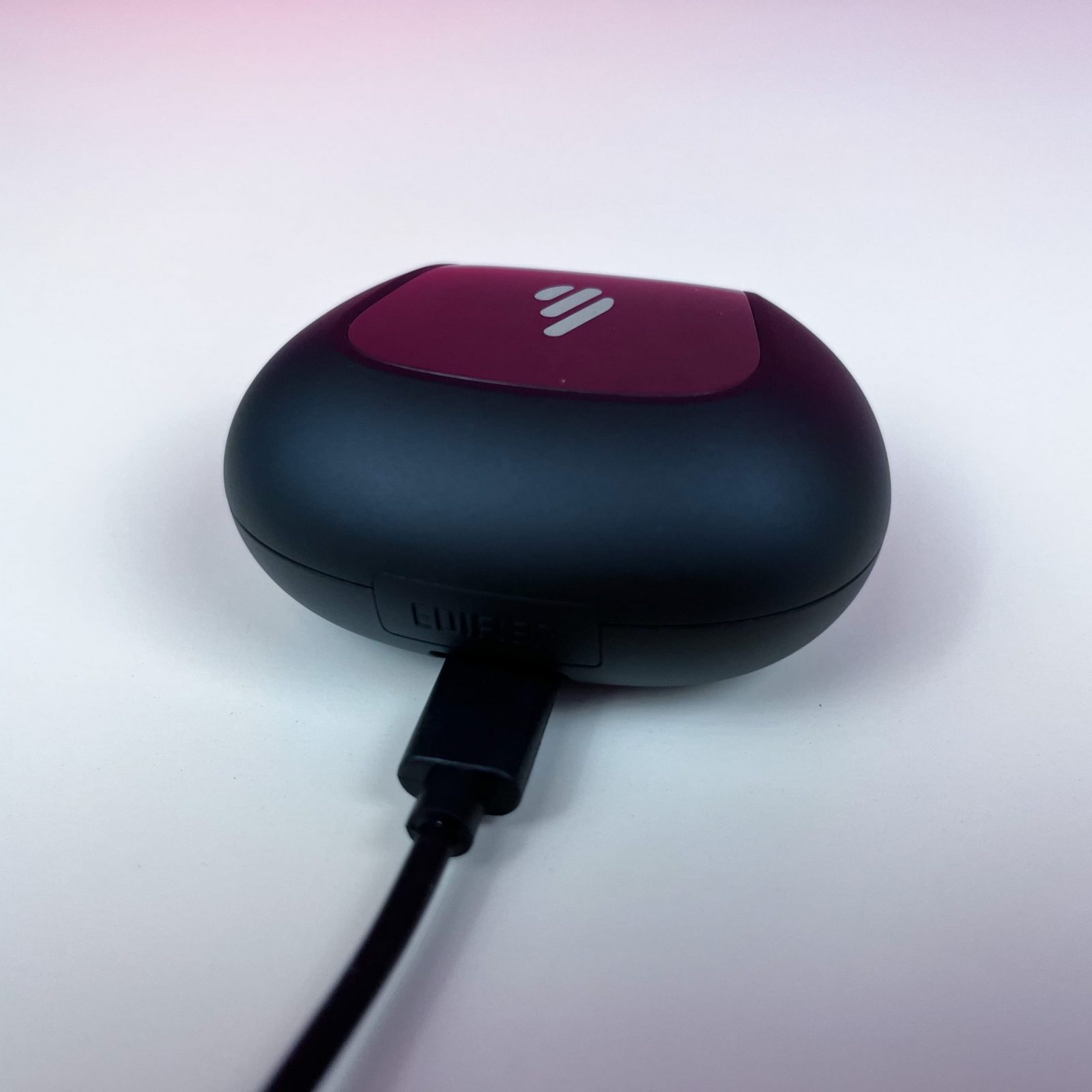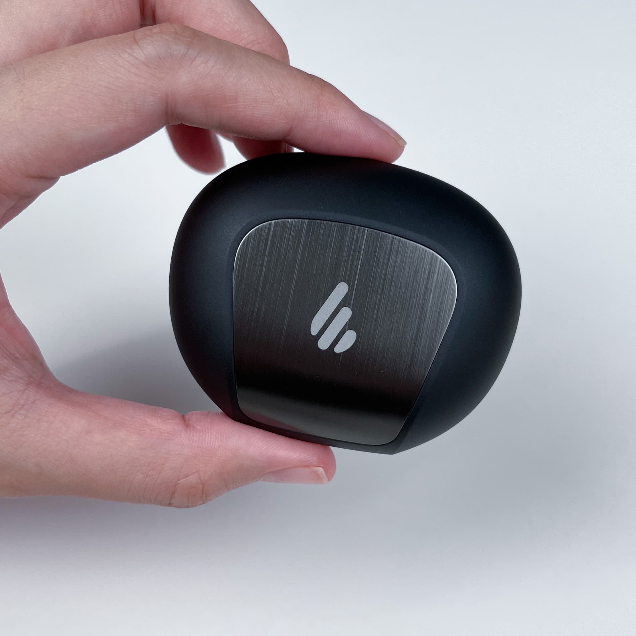 ที่กล่องชาร์จมีการแปะแผ่นอลูมิเนียมยิงโลโก้ EDIFIER ให้ความรู้สึกเรียบหรูและดูเท่ เวลาเปิดกล่องชาร์จขึ้นมาจะมีไฟ LED สีแดงกระพริบ วิ่งไปมาที่บริเวณหน้ากล่องชาร์จ