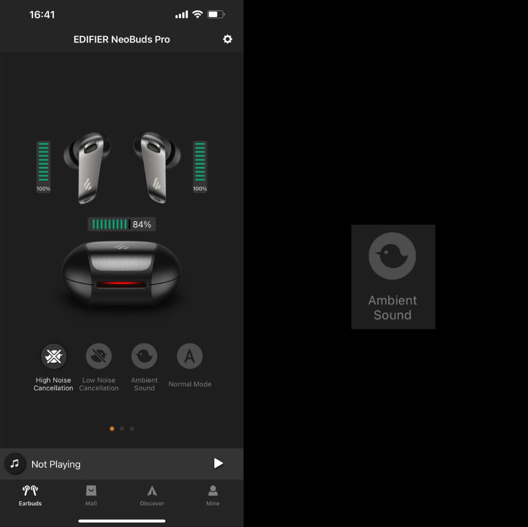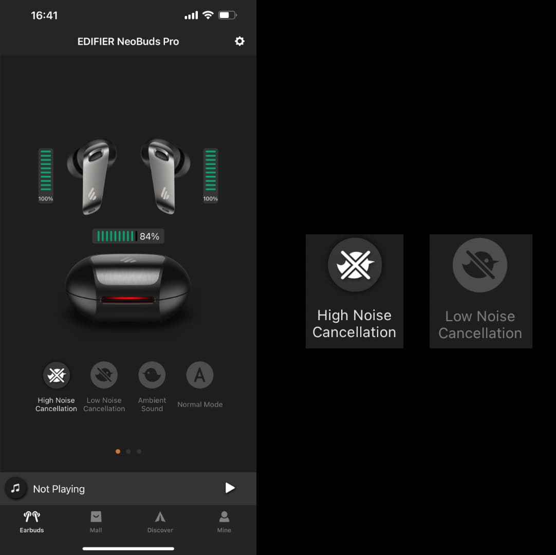 ภายในแอป Edifier Connect นั้น เราสามารถเลือกปรับโหมดต่าง ๆ ได้ง่าย ไม่ว่าเป็นโหมดตัดเสียงรบกวน (ANC) ที่สามารถเลือกใช้ได้ถึง 2 ระดับ ได้แก่ ระดับ High Noise Cancellation ที่ตัดเสียงรอบข้างแบบสูงสุด และระดับ Low Noise Cancellation ที่จะช่วยตัดเสียงรอบข้างระดับกลาง ยังคงได้ยินเสียงภายนอกอยู่นิดหน่อย