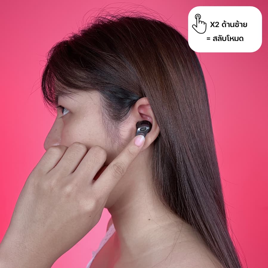 - แตะ 2 ครั้งที่หูฟังด้านซ้ายสองครั้ง เพื่อเปลี่ยนโหมด โดยจะเป็นการสลับระหว่างโหมด ANC และ Ambient Sound ระหว่างที่แตะเพื่อเปลี่ยนโหมดจะมีเสียงแจ้งเตือนในแต่ละโหมดเพิ่มความสะดวก