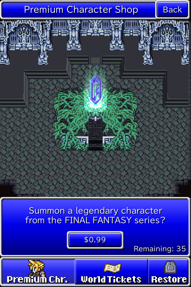 Shop > ขายของ In Apps ต่างๆ ประกอบด้วยตัวละครจากภาคต่างๆ 35 ตัว ตัวละ 0.99$ และ MAP เพิ่มอีก 3 MAP MAP ละ 3.99$
