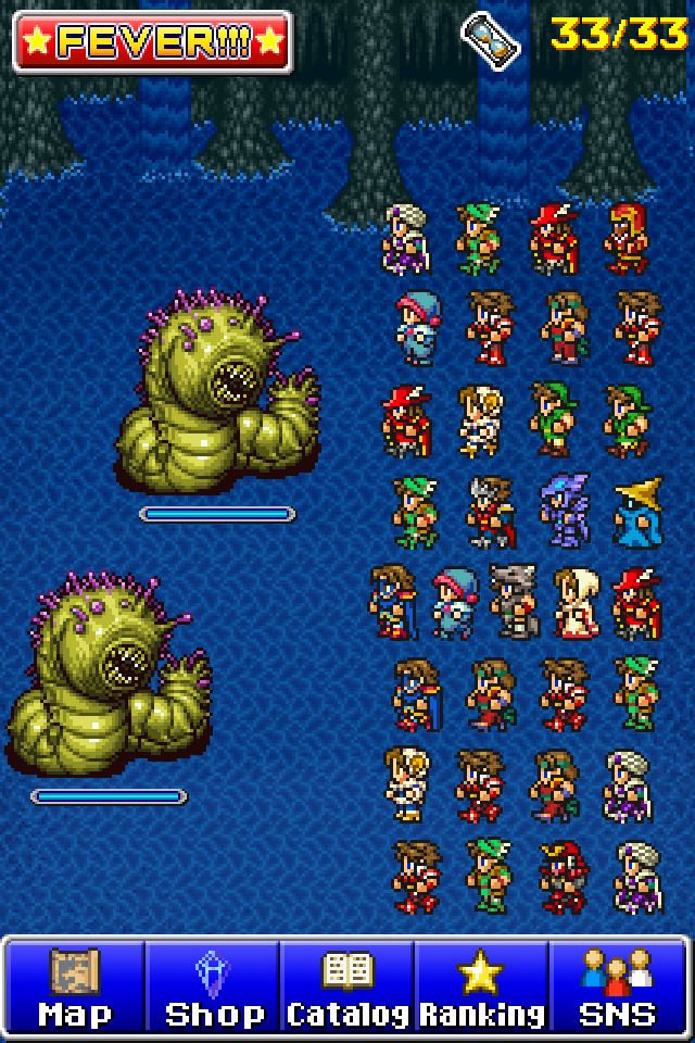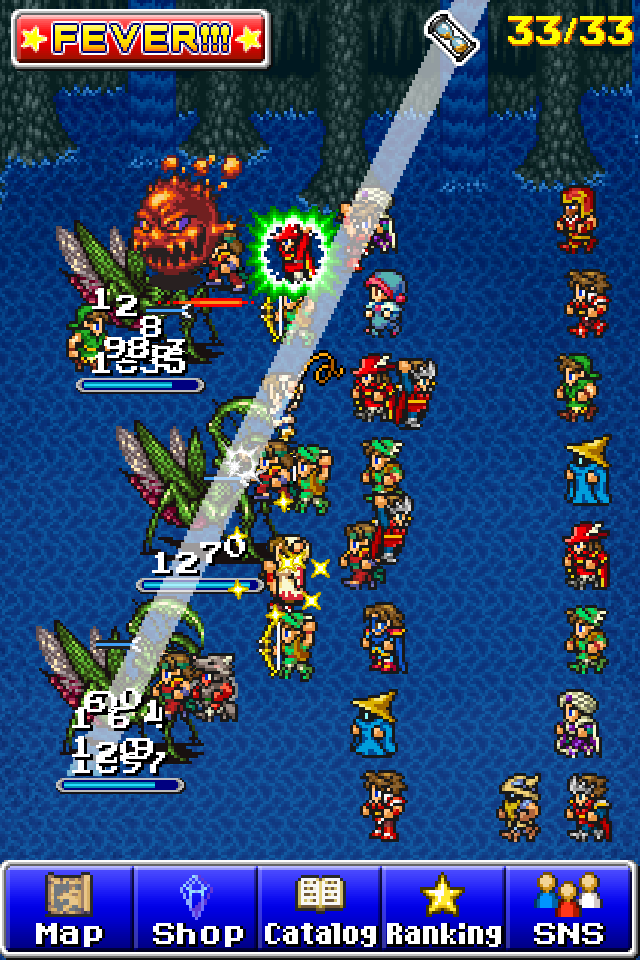 แถบ Fever ด้านซ้ายบนจะมาทุก 3 ชม. โดยกดแล้วจะสามารถโจมตีได้โดยไม่ต้องสนใจ ATB ได้ชั่วระยะเวลาหนึ่ง (Damage ที่ทำได้ในช่วง Fever จะถูกอัพขึ้น Game Center ครับ)