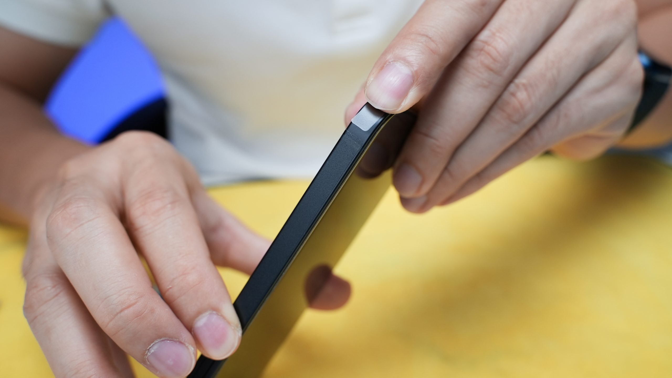จากนั้น ใช้สติ๊กเกอร์ช่วยเก็บฝุ่นรอบขอบข้างเครื่อง และแกะฟิล์มชิ้นที่ยาวที่สุดมาติดขอบด้านข้างของเครื่อง เริ่มจากข้างบนโดยใช้สติ๊กเกอร์ช่วยลอกฟิล์มออกมา จากนั้นนำชิ้นเล็ก 2 ชิ้นที่เหลือมาติดที่มุมด้านล่างของเครื่อง