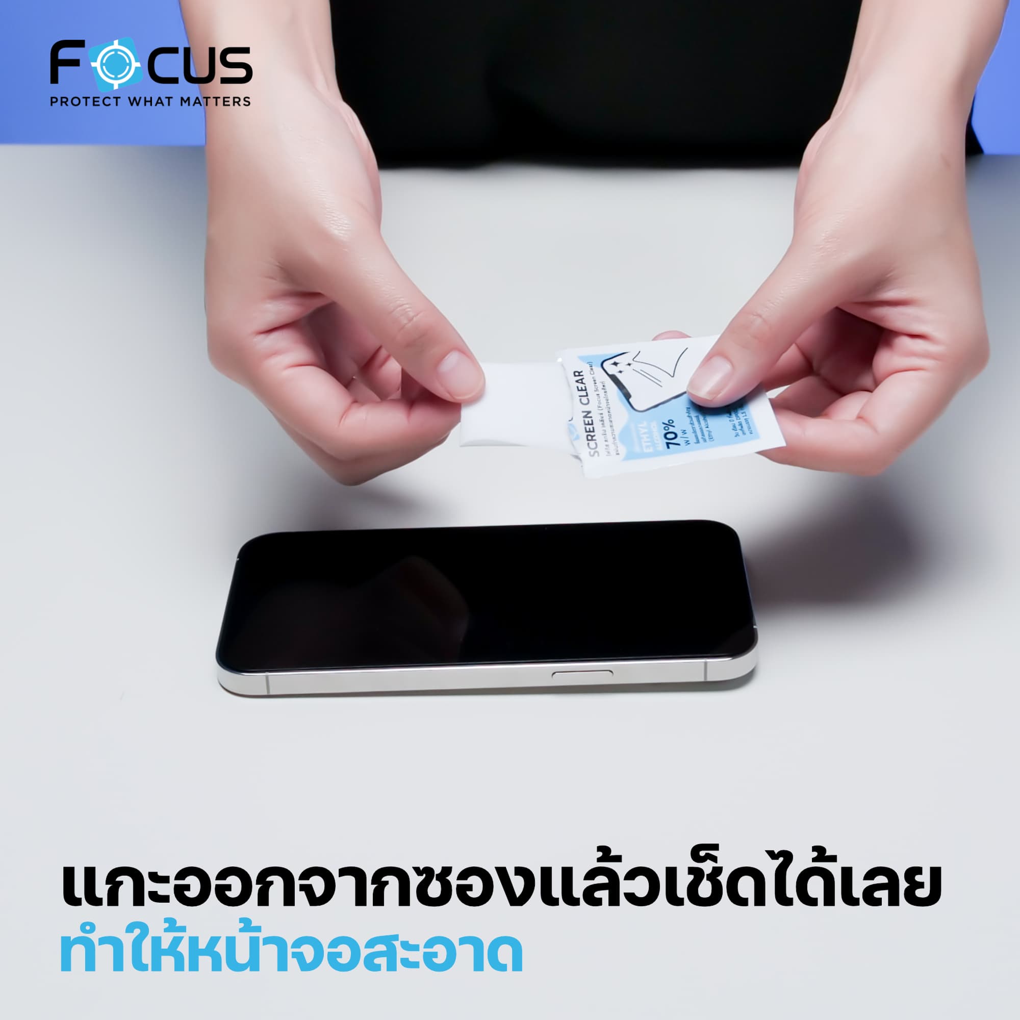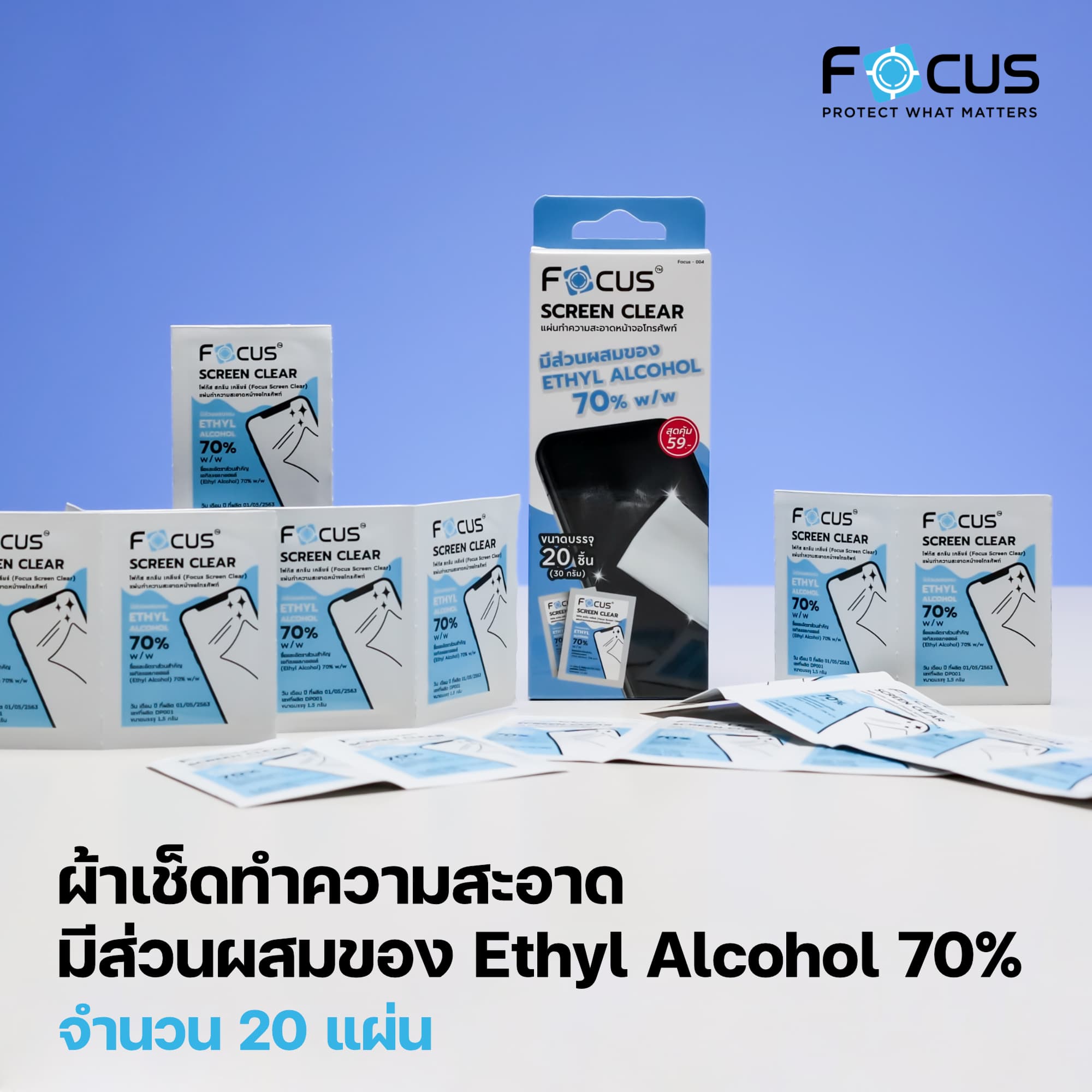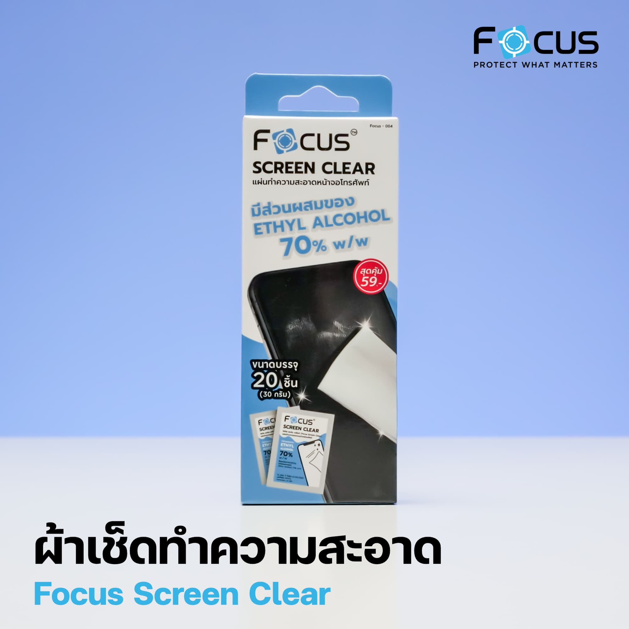 แผ่นทำความสะอาดหน้าจอ Focus Screen Clear ให้มาในกล่องทั้งหมด 20 แผ่น บรรจุอยู่ในซองเล็ก ๆ พกพาติดกระเป๋าได้สบาย
