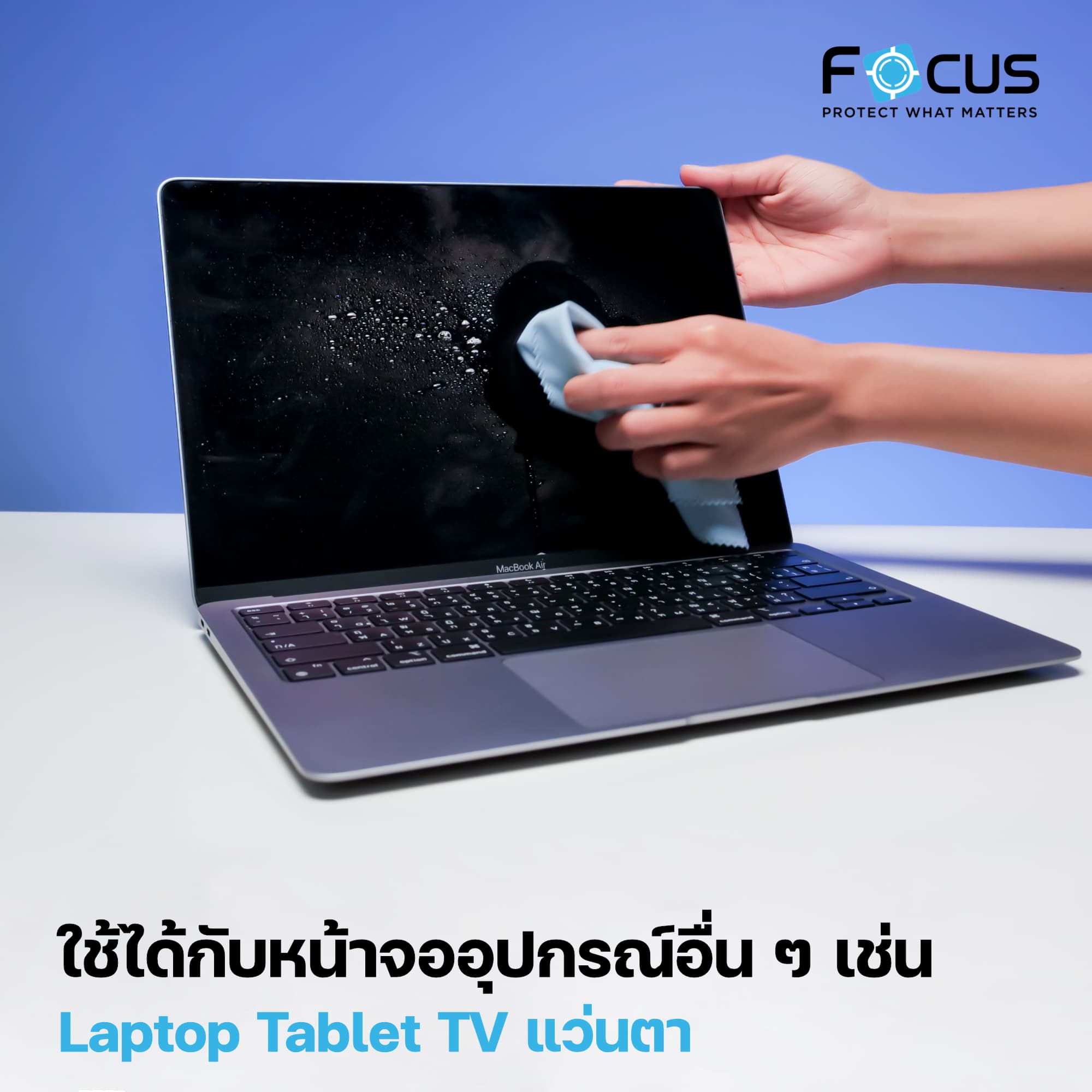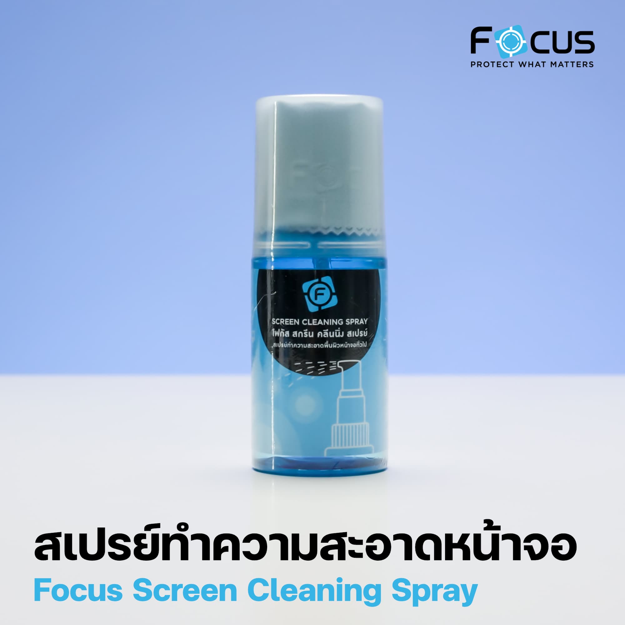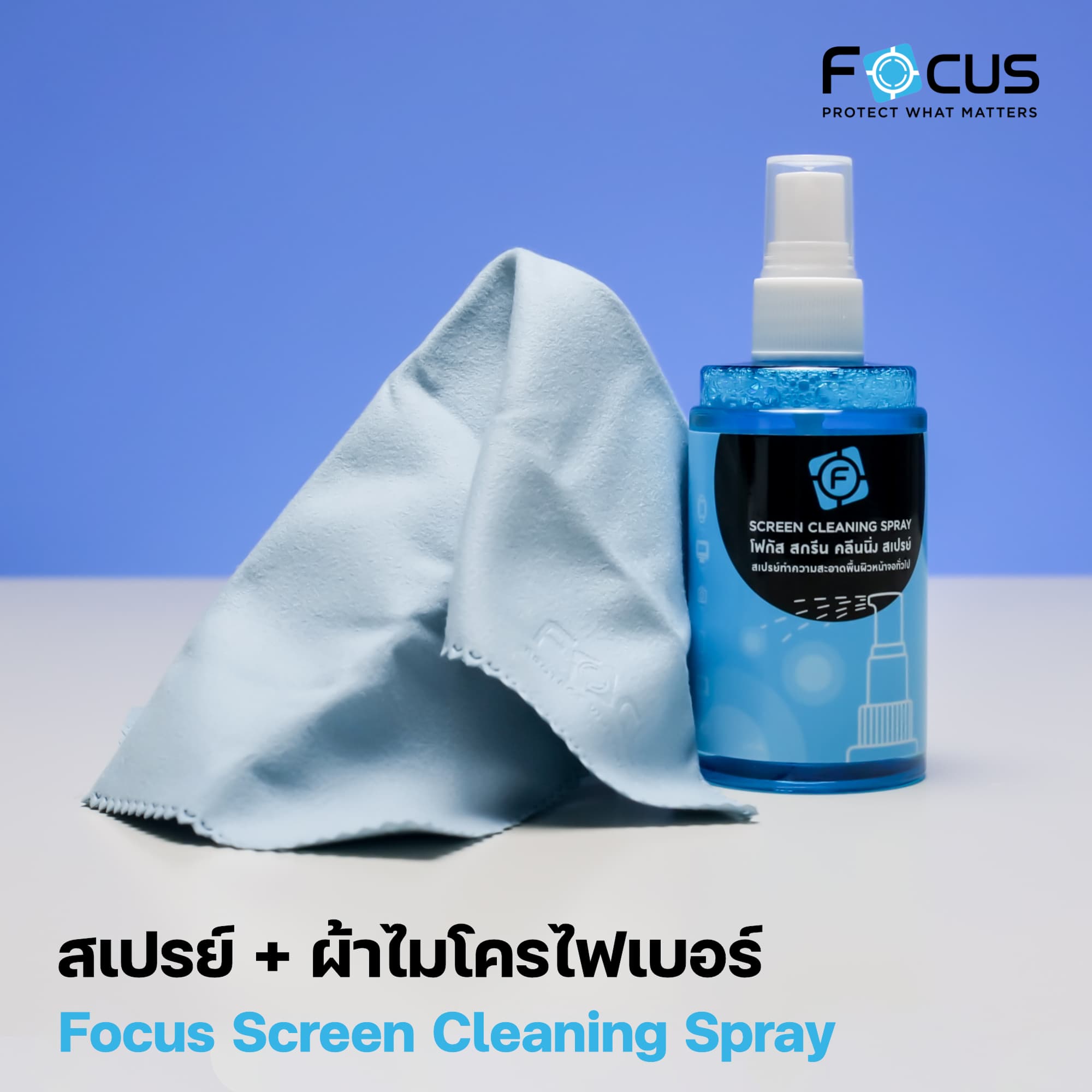 Focus ให้ตัวสเปรย์มาในขวดที่ค่อนข้างใหญ่ ใช้งานได้หลายครั้ง แถมยังมีผ้าไมโครไฟเบอร์นุ่ม ๆ ขนาดกำลังดีมาให้เราใช้เช็ดหน้าจอด้วย