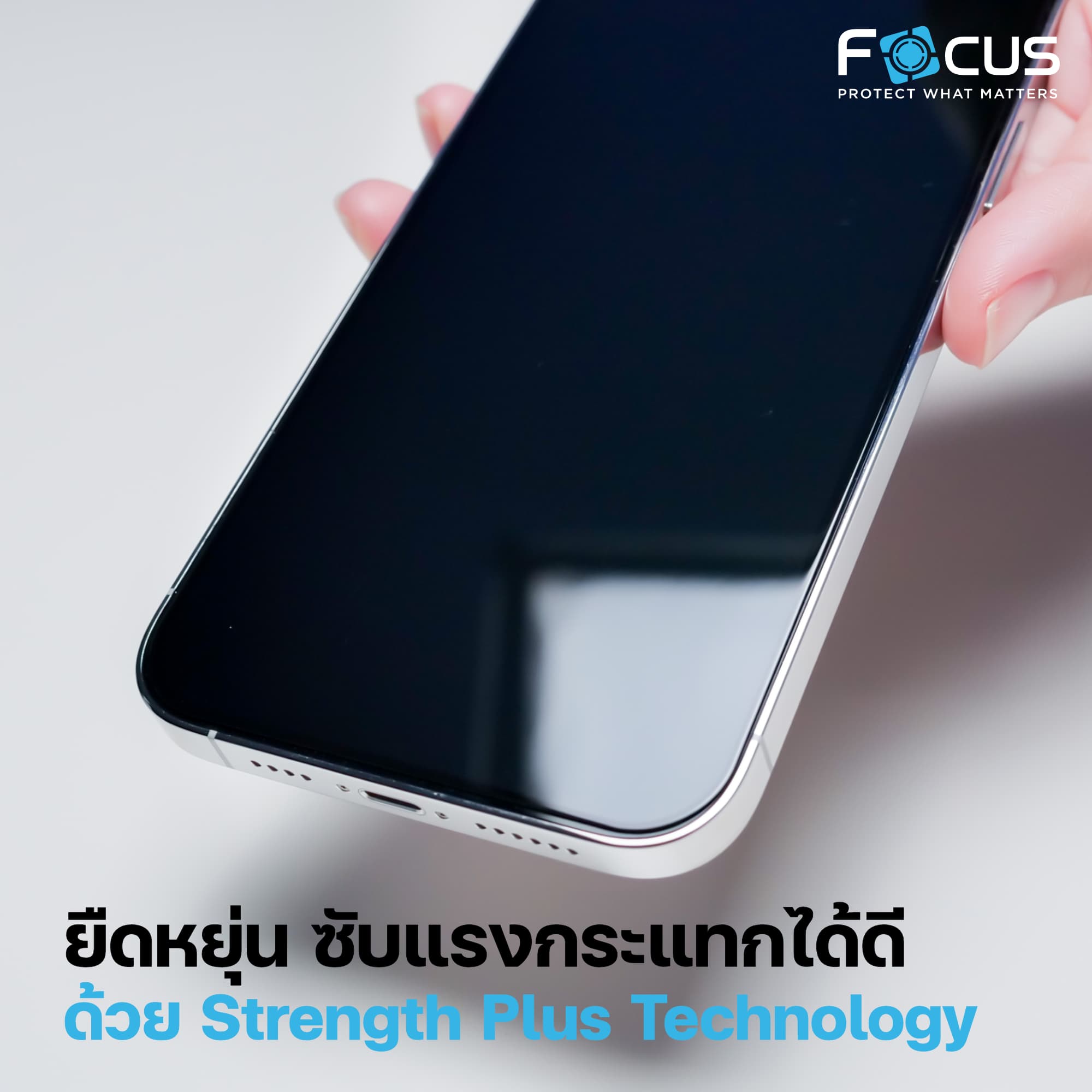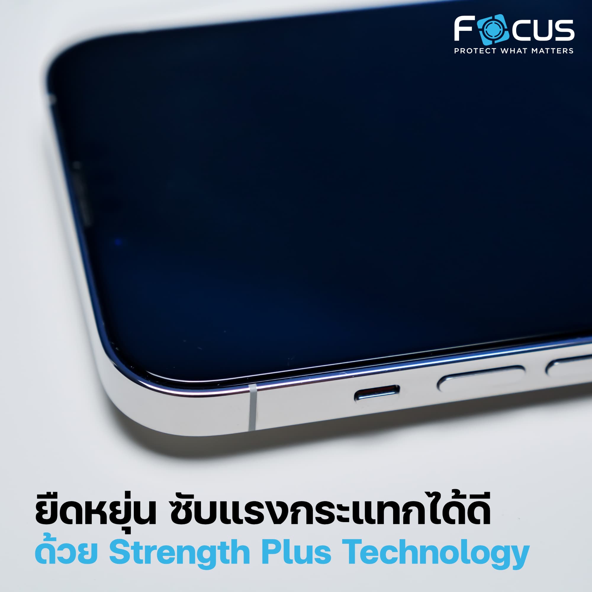 ปกป้องหน้าจออย่างมั่นใจด้วยฟิล์มกระจกกันรอย Focus Ultimate Glass ตัวฟิล์มกระจกที่อยู่ในกล่องนี้เป็นฟิล์มกระจกที่ใช้กระบวนการผลิตด้วย Strength Plus Technology ช่วยเพิ่มประสิทธิภาพทั้งในด้านความยืดหยุ่นและการซับแรงกระแทกได้ดี