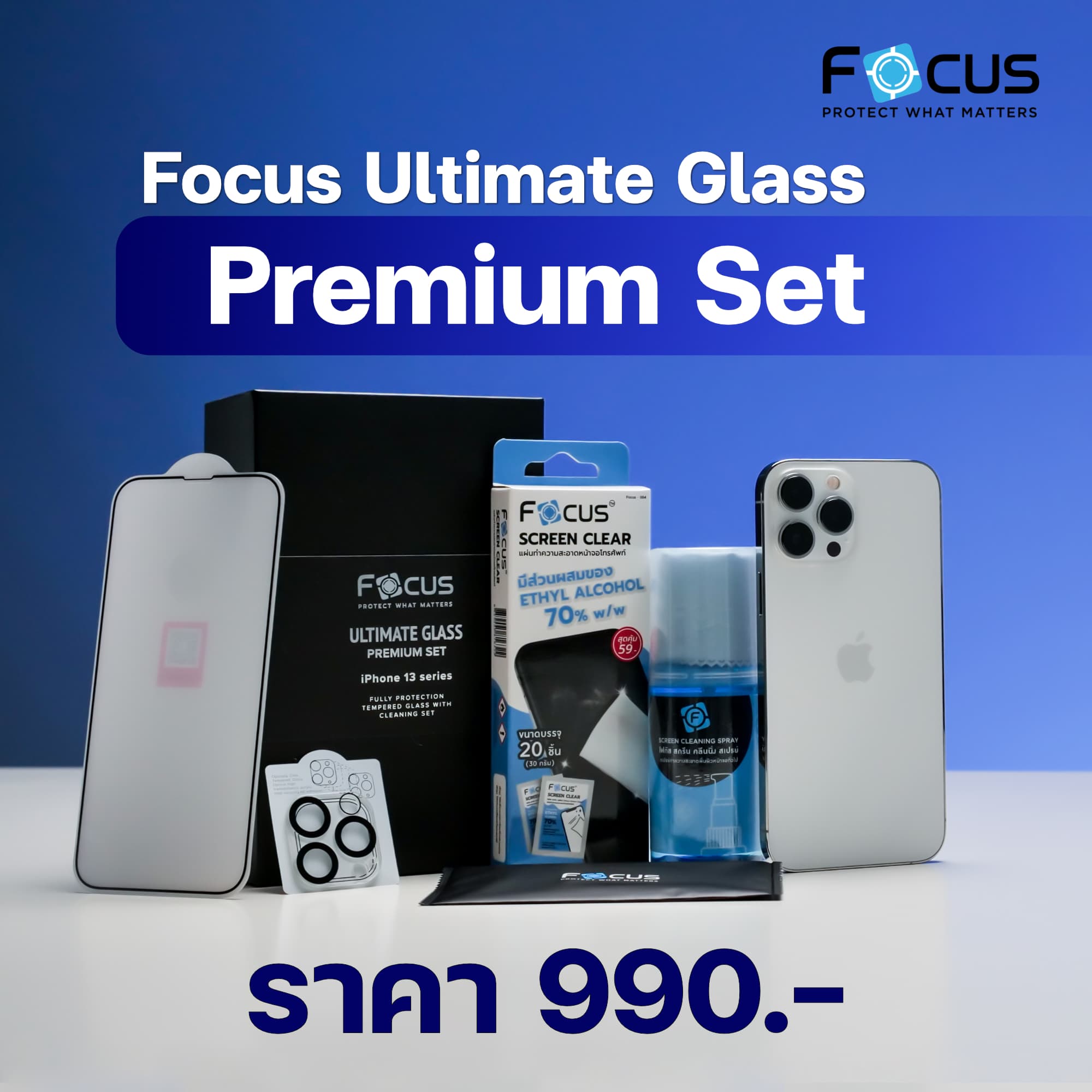 Focus Ultimate Glass Premium Set ขายในราคา 990 บาท เรียกได้ว่าแค่มีกระจกกันรอยหน้าจอก็คุ้มแล้ว แต่เรายังได้ไอเท็มอื่น ๆ ในกล่องมาอีก เหมาะสำหรับคนที่พึ่งซื้อ iPhone เครื่องใหม่แล้วอยากจะติดกระจกกันรอยแบบยกเซ็ต จบในครั้งเดียว หรือเหมาะสำหรับคนที่อยากเปลี่ยนเซ็ตใหม่เพราะใช้มานานแล้ว