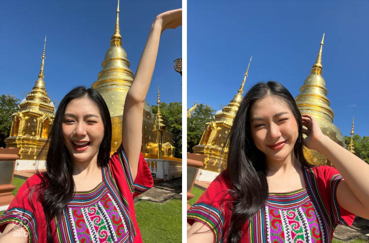 ในส่วนเลนส์ไวด์ระยะ 1X ใน iPhone 13 Pro มี HDR อัจฉริยะ 4 ภาพที่ถ่ายออกมาชัดเจน สีสดชัด รายละเอียดค่อนข้างดี เมื่อลองถ่ายย้อนแสง หน้าของแบบไม่ค่อยมืด และด้วยรูรับแสงกว้างขึ้นและเซ็นเซอร์ใหญ่ขึ้นทำให้สามารถรับแสงได้มากขึ้นสูงสุดถึง 2.2 เท่าเมื่อเทียบกับ iPhone 12 Pro ทำให้การถ่ายโหมดกลางคืนถ่ายออกมาได้ดียิ่งขึ้น ตามตัวอย่างที่ได้เลย