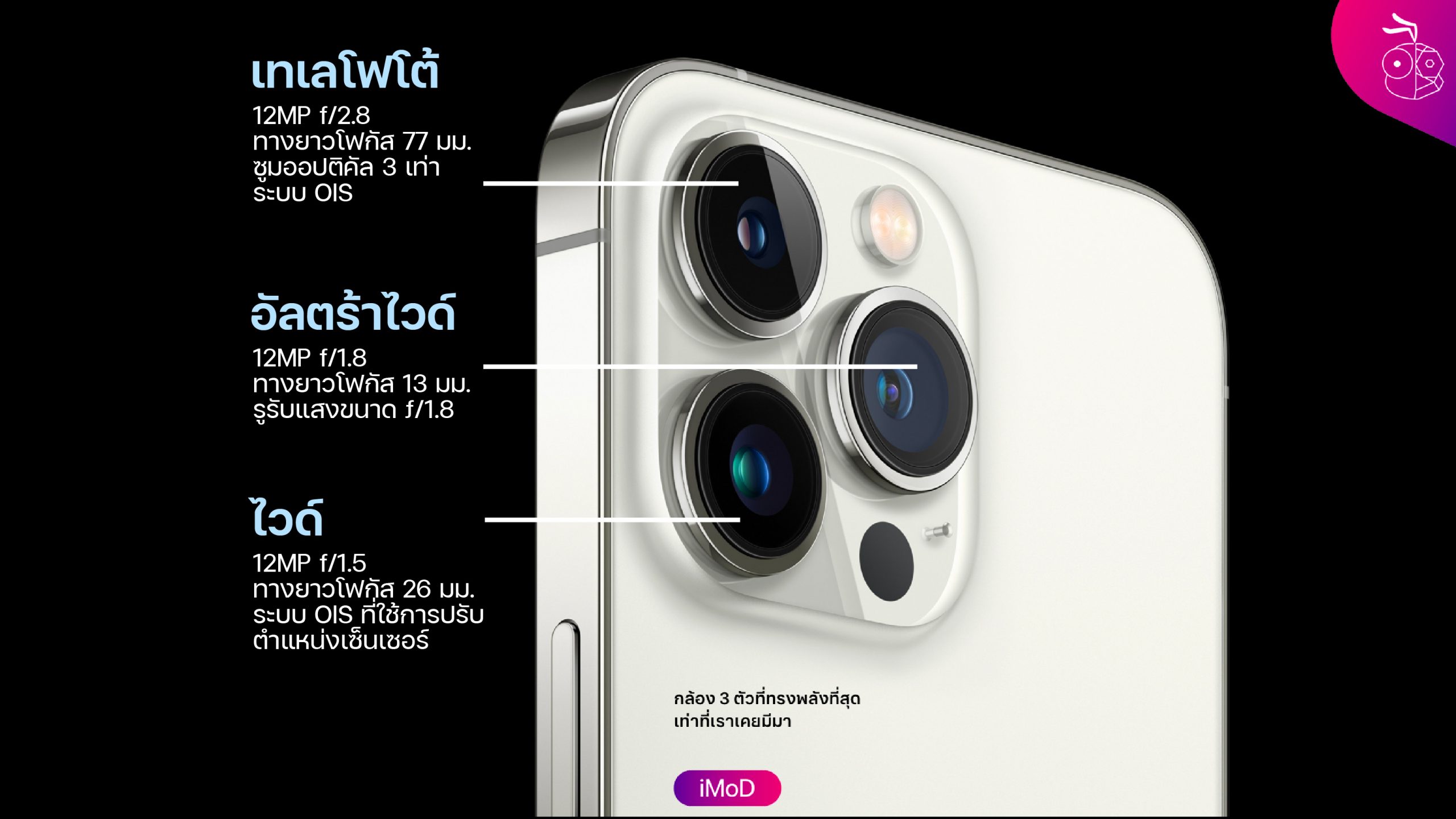 ใน iPhone 13 Pro นั้นมีการปรับระยะของเทเลโฟโต้ ให้มีระยะโฟกัส 77 มม. และปรับระยะซูมแบบออปติคัลในระยะ 3X จากปกติแล้วใน iPhone 12 Pro ระยะซูมแบบออปติคัลจะอยู่ที่ 2.5X ใน iPhone 13 Pro ช่วงซูมแบบออปติคัลเมื่อรวมทั้งระบบแล้วจะอยู่ที่ 6X การปรับเลนส์เทเลโฟโต้นี้ทำให้เราซูมได้มากขึ้น เหมาะมากสำหรับการถ่ายภาพบุคคล หรือ การถ่ายภาพจากระยะไกลแล้วสามารถซูมถ่ายใกล้ ๆ ได้ชัดยิ่งขึ้น