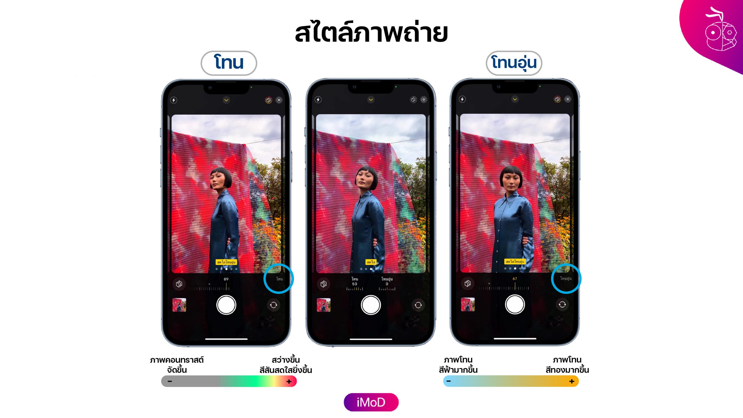 ใน iPhone 13 Pro จะมีฟีเจอร์สไตล์ภาพถ่ายที่เราสามารถปรับความสว่าง ปรับสี ปรับอุณภูมิ โทนต่าง ๆ ให้กับกล้องก่อนจะถ่ายรูป เช่น ต้องการถ่ายรูปโลเคชันสว่าง ๆ และต้องการปรับสีสไตล์ภาพให้ออกมาไม่สว่างมาก และลดโทนให้เย็นขึ้น ก็สามารถปรับก่อนถ่ายรูปได้เลย โดยที่เราไม่ต้องมาเสียเวลาแก้ไขโทนสีภาพทีละภาพ