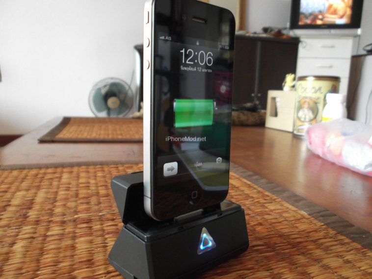 ภาพอีกตัวหนึ่ง ตัวฐานแข็งแรงดีครับไม่ดูเหมือนจะโอนเองหรือหักได้ง่าย ๆ (ลองนึกถึง Dock ที่ Apple ขายก็ตั้งแบบนี้ไม่มีอะไรค้ำเหมือนกัน) ซึ่งตัวนี้ซื้อ 1 เหมือนได้ถึง 2 คือเป็นทั้ง Dock สำหรับตั้งเครื่องและแบตฯ สำรองในตัวด้วย (น่าเสียดายที่ Sync ข้อมูลไม่ได้เพราะไม่มีให้เสียบ USB เข้ากับคอมฯ ไม่งั้นล่ะก็แจ่มไปเลย