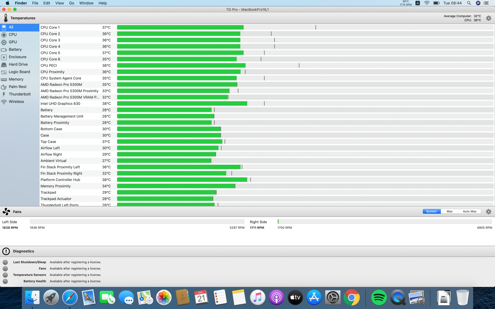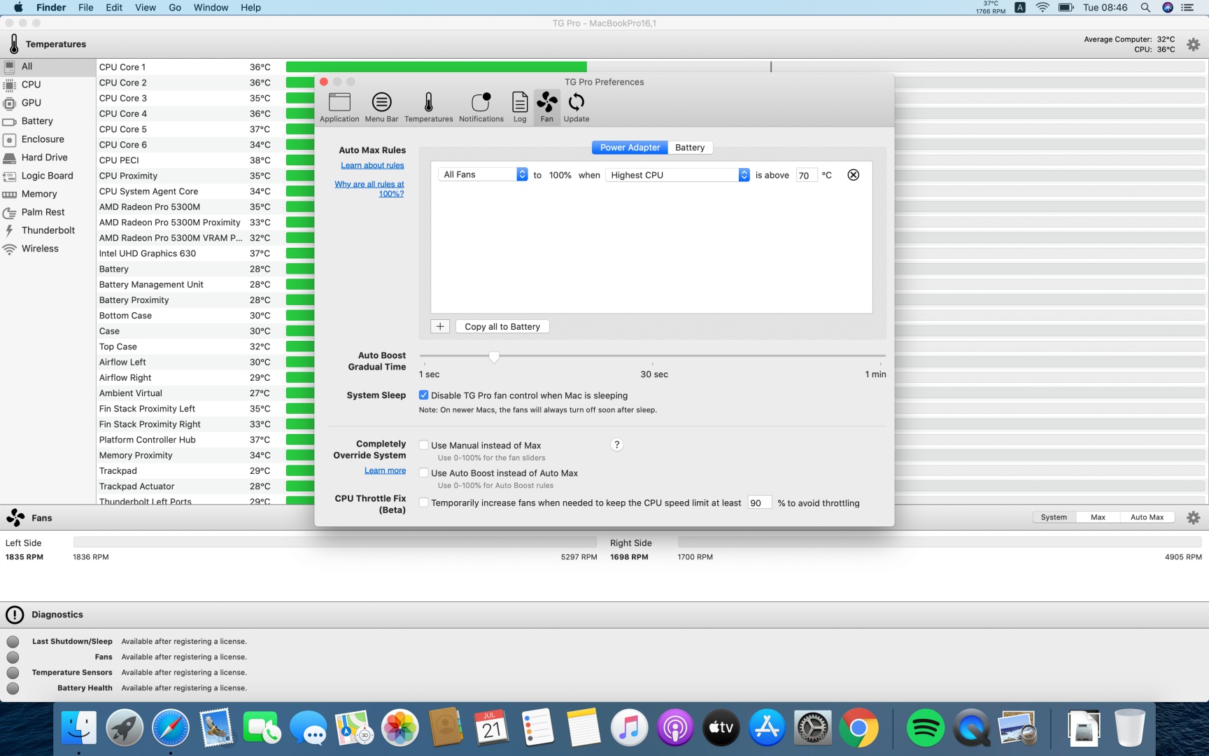 TG Pro สามารถใช้กับ Mac ได้ทุกรุ่นตั้งแต่ปี 2008-2020 เพียงแต่หากเป็นรุ่น 2018-2020 (ที่มีชิป T2) จะไม่สามารถปรับความเร็วรอบพัดลมได้เอง เพื่อป้องกันผู้ใช้งานปรับรอบต่ำเกินไป TG Pro เลยปรับเป็น Auto Max ซึ่งจะช่วยให้เครื่องเย็นลงด้วยความเร็วพัดลมสูงสุด 100% แลกกับเสียงพัดลมที่อาจดังขึ้นหน่อยมากกว่าปกติ