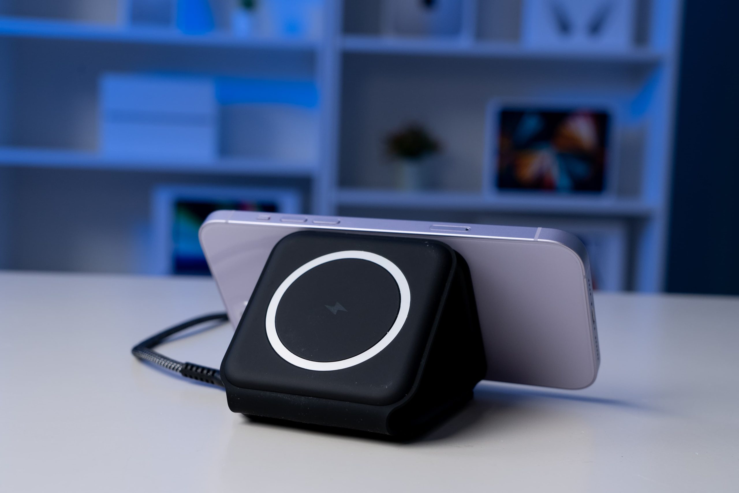ชาร์จ iPhone พร้อมใช้เป็นขาตั้ง ไม่ต้องกลัวว่าเวลาชาร์จแล้ว iPhone จะไหลลงมา เพราะมี MagSafe ยึดอยู่ (รองรับ iPhone 12 หรือใหม่กว่า)