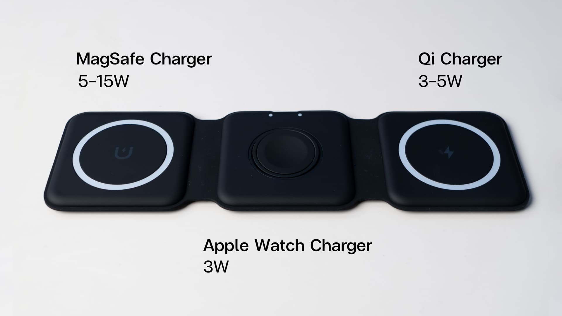 แท่นชาร์จตรงกลางเป็นแท่นชาร์จสำหรับ Apple Watch ชาร์จได้สูงสุด 3W และแท่นชาร์จที่มีสัญลักษณ์รูปการชาร์จจะรองรับอุปกรณ์ต่าง ๆ ที่รองรับการชาร์จไร้สายแบบ Qi เช่น AirPods หูฟังไร้สาย โทรศัพท์มือถือ และอื่น ๆ