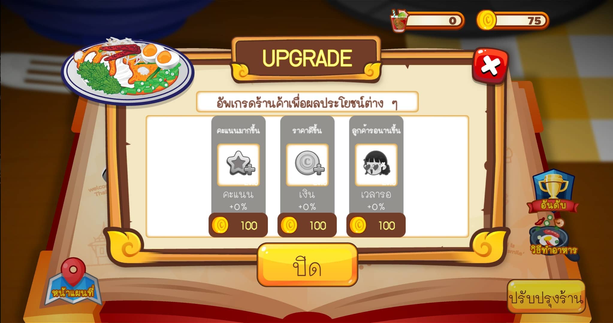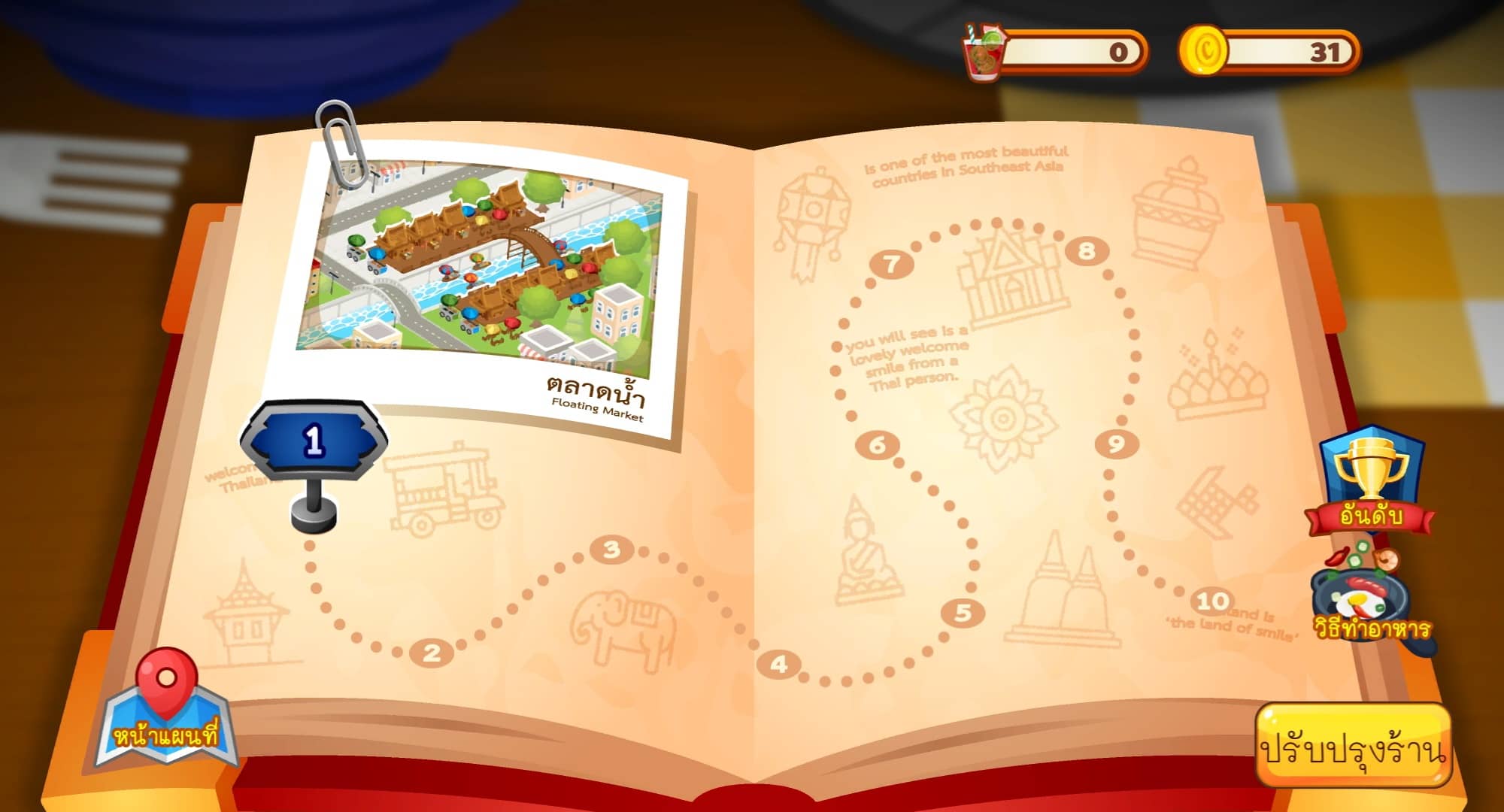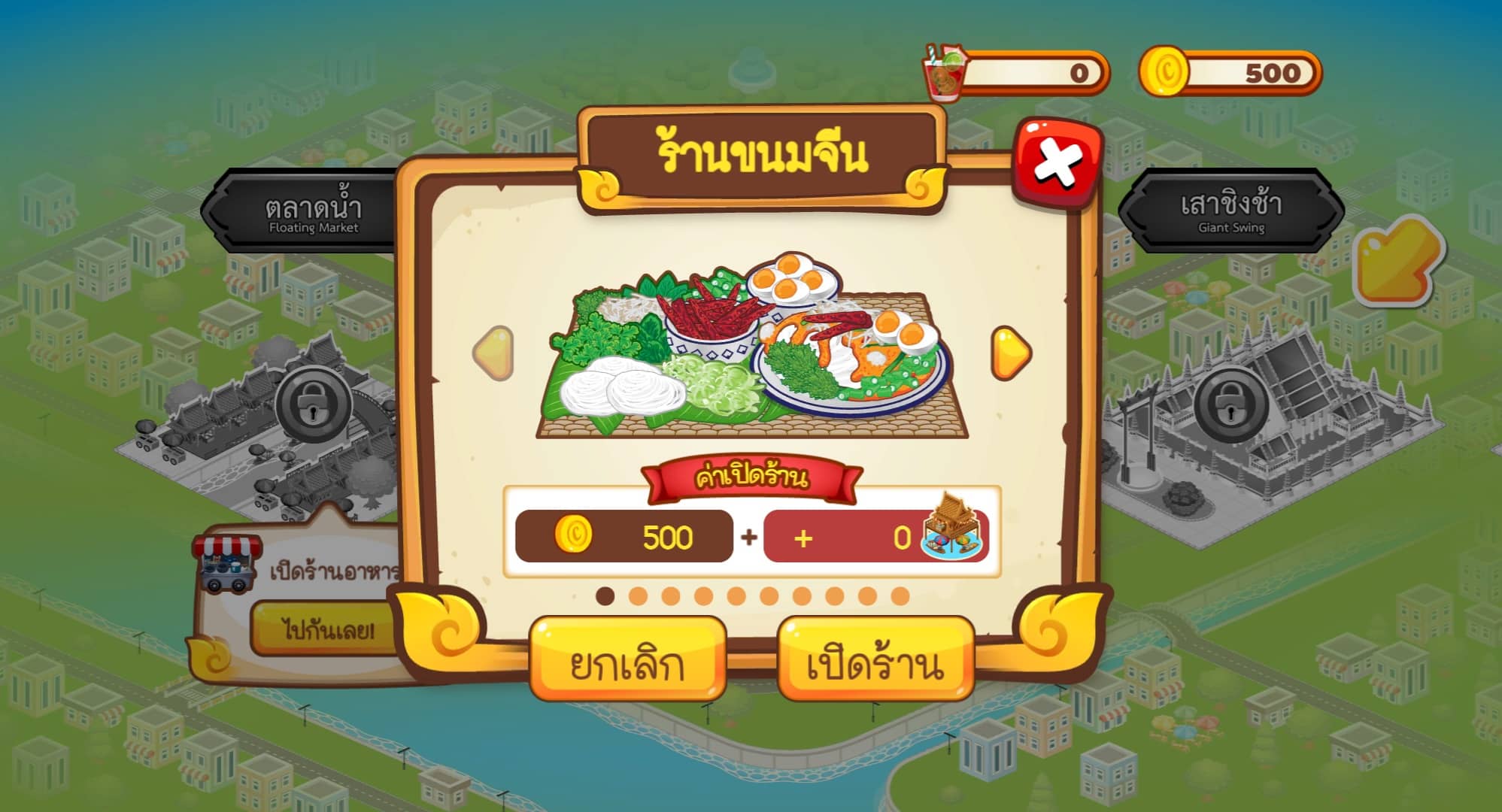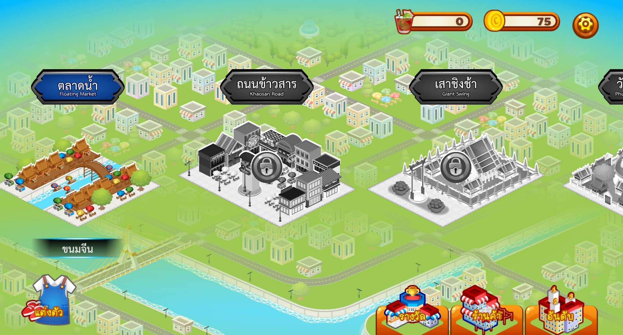 ตัวแมพในเกมจะมีสถานที่ให้เราเลือกขายอาหารได้เพียบ ไม่ว่าจะเป็น ตลาดน้ำ ถนนข้าวสาร เสาชิงช้า และอื่น ๆ