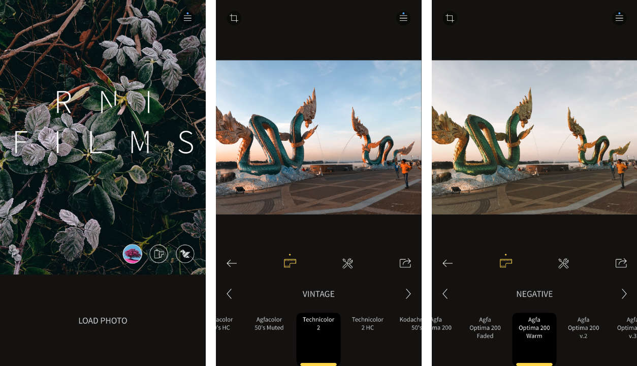 RNI Films มาพร้อมกับฟิลเตอร์ 5 ประเภทหลักๆ ได้แก่ Vintage, Negative, Slide, Instant และ BW โดยฟิลเตอร์แต่ละประเภทนั้นก็ให้สไตล์ของภาพที่แตกต่างกันออกไป (มีให้เลือกใช้งานมากกว่า 150 แบบตามความชอบ)