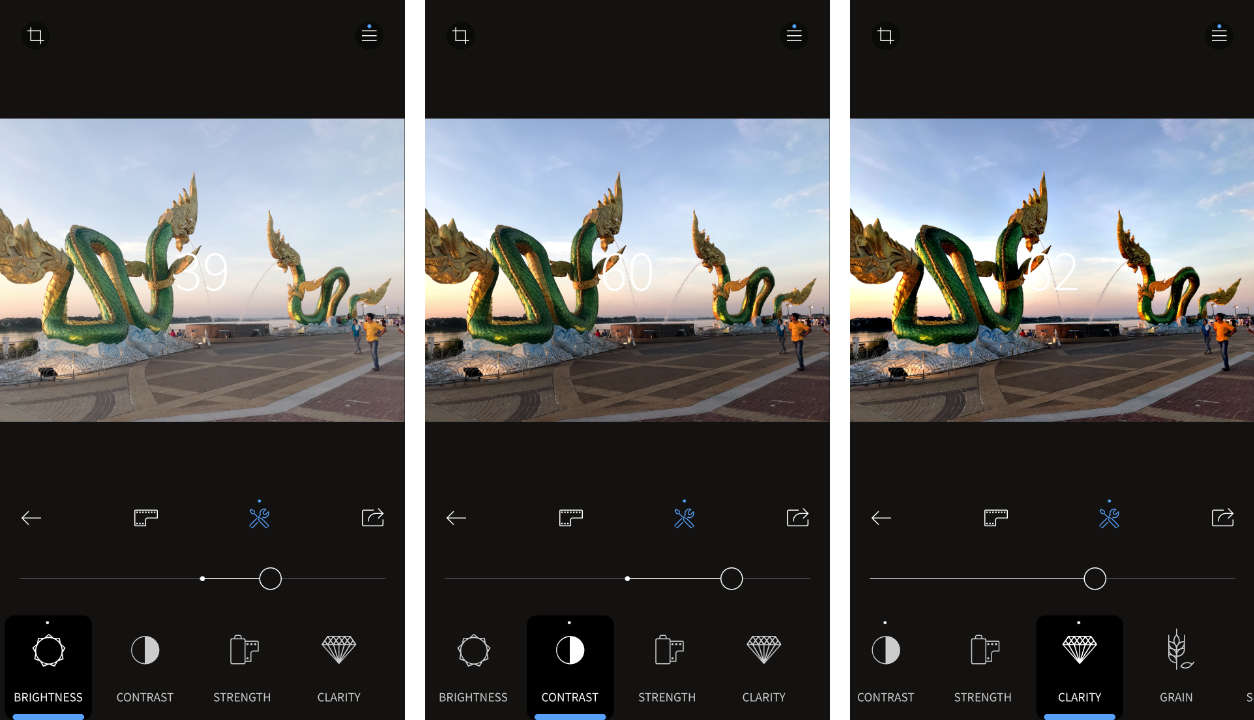 ถ้าหากยังไม่โดนใจ! คุณก็ยังสามารถใช้เครื่องมือปรับแต่งด้วยตนเองแบบ Manual ที่มีมาให้ได้อีกด้วย เช่น Brihtness, Contrast, Strength, Clarity, Grain, Shadows, Highlights, Fade เป็นต้น