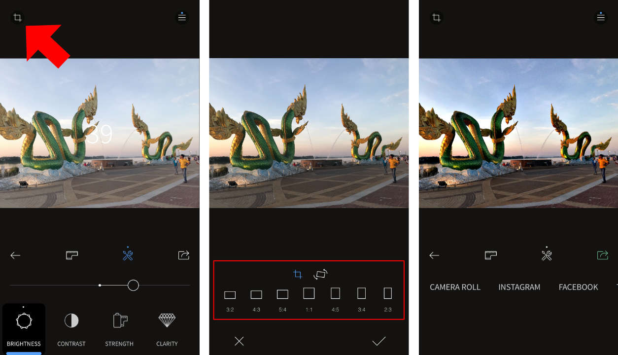 สำหรับการบันทึกนั้นก็ง่ายมาก เพียงกดปุ่ม Export (ขวามือสุด) และเลือกประเภทการบันทึกว่าจะให้บันทึกเป็นแบบไหน เช่น บันทึกลงเครื่อง, บันทึกสำหรับโพสต์บน Facebook, บันทึกสำหรับโพสต์ลง Instagram เป็นต้น ซึ่งคุณสามารถกำหนดขนาดของภาพด้วยตนเองได้อีกด้วย