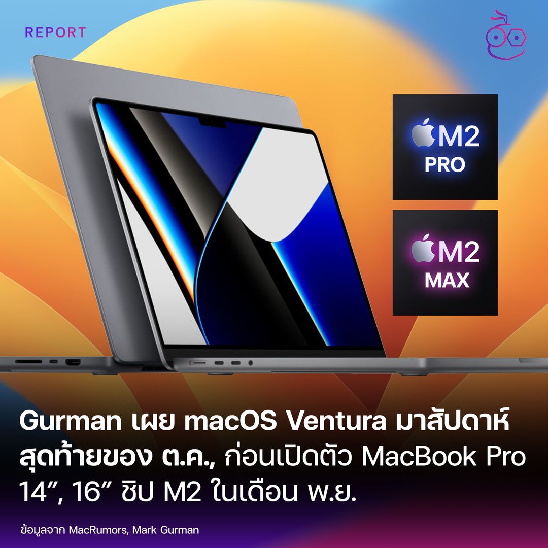 Gurman เผยว่า macOS Ventura เวอร์ชันแรกที่ปล่อยอัปเดตมานั้นจะรองรับ MacBook Pro 14″, 16″ ตัวใหม่ที่จะเปิดตัวหลังจากนี้อีกไม่นาน MacBook Pro 14″, 16″ ตัวใหม่ลือว่าจะมาพร้อมชิป M2 Pro, M2 Max ที่ตัวเครื่องยังคงใช้ดีไซน์เดิม แต่ปรับปรุงสเปคให้ทันสมัยขึ้น