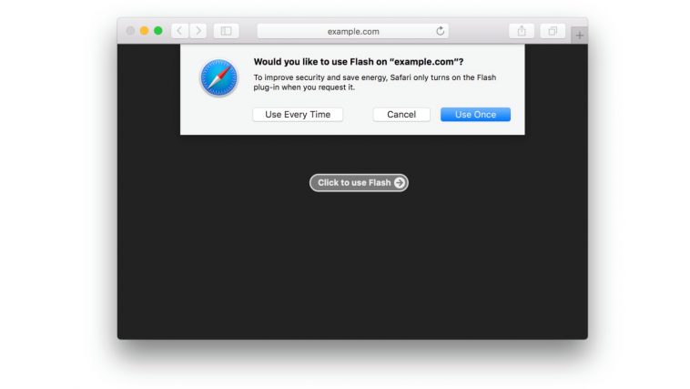 เพื่อเป็นการสนับสนุนและผลักดัน HTML5 โดยปกติหากคุณเปิดหน้าเว็บที่มี Flash ทางโปรแกรม Safari จะเรียกไปหน้า Adobe เพื่อดาวน์โหลด (หรือหากมีแล้วก็ไม่เรียก) แต่ในคุณสมบัติใหม่นี้ค่าเริ่มต้นจะปิดอยู่ตลอดเวลาและถาม “ทุกครั้ง” ว่าคุณต้องการเปิดชั่วตราวหรือไม่