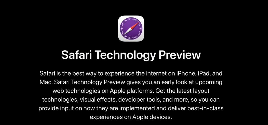 Apple ได้ออกแบบ Safari Technology Preview เพื่อทดสอบคุณสมบัติที่อาจนํามาใช้ใน Safari เวอร์ชันที่จะเปิดตัวในอนาคต รวมถึงการแก้ไขและอัปเดตสําหรับ ได้แก่ Canvas, CSS, Forms, JavaScript, Media, Rendering, Security, SVG, Web Inspector, WebDriver และ WebGL