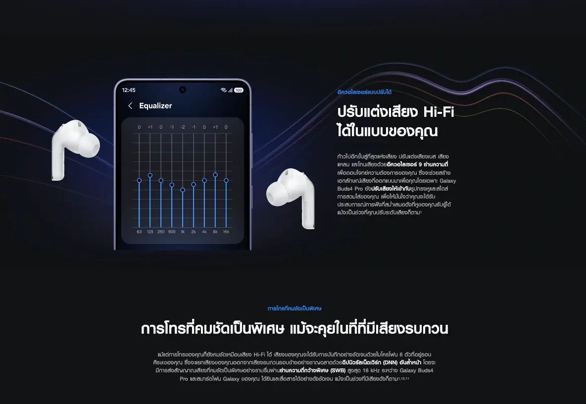 โดยจะมีการส่งสัญญาณเสียงที่คมชัดเป็นพิเศษอย่างราบรื่นผ่านย่านความถี่กว้างพิเศษ (SWB) สูงสุด 16 kHz ระหว่าง Galaxy Buds4 Series และสมาร์ตโฟน Galaxy