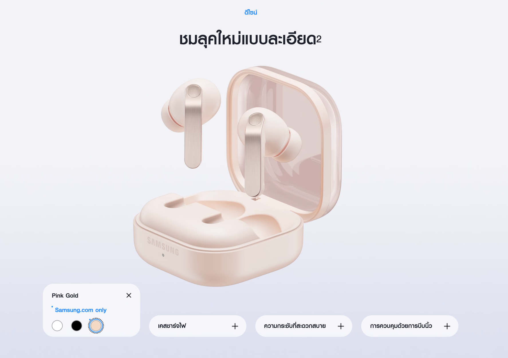 Galaxy Buds4 Pro มีให้เลือกทั้ง White, Black และมาพร้อมสี Pink Gold วางจำหน่ายเฉพาะที่ Samsung.com