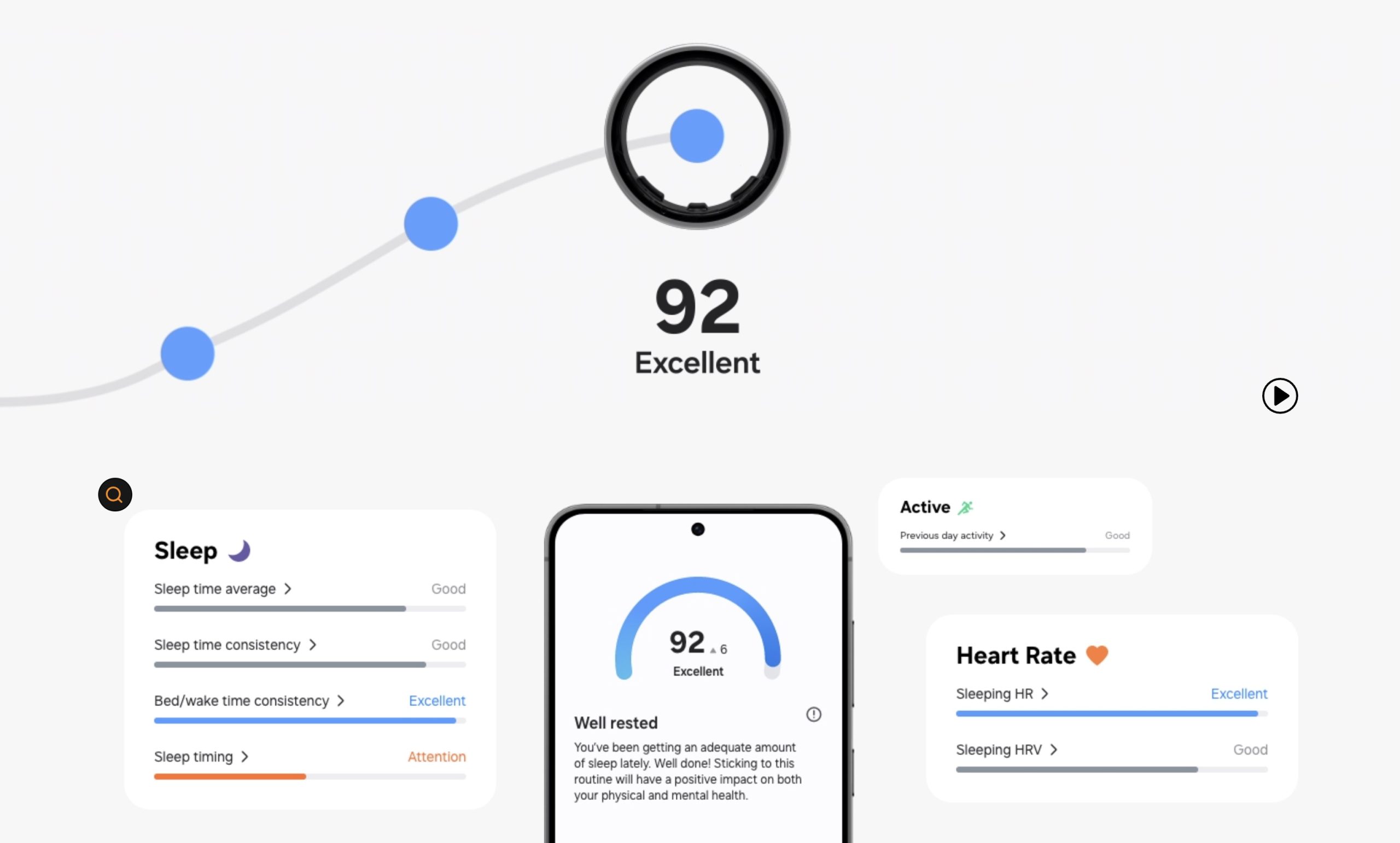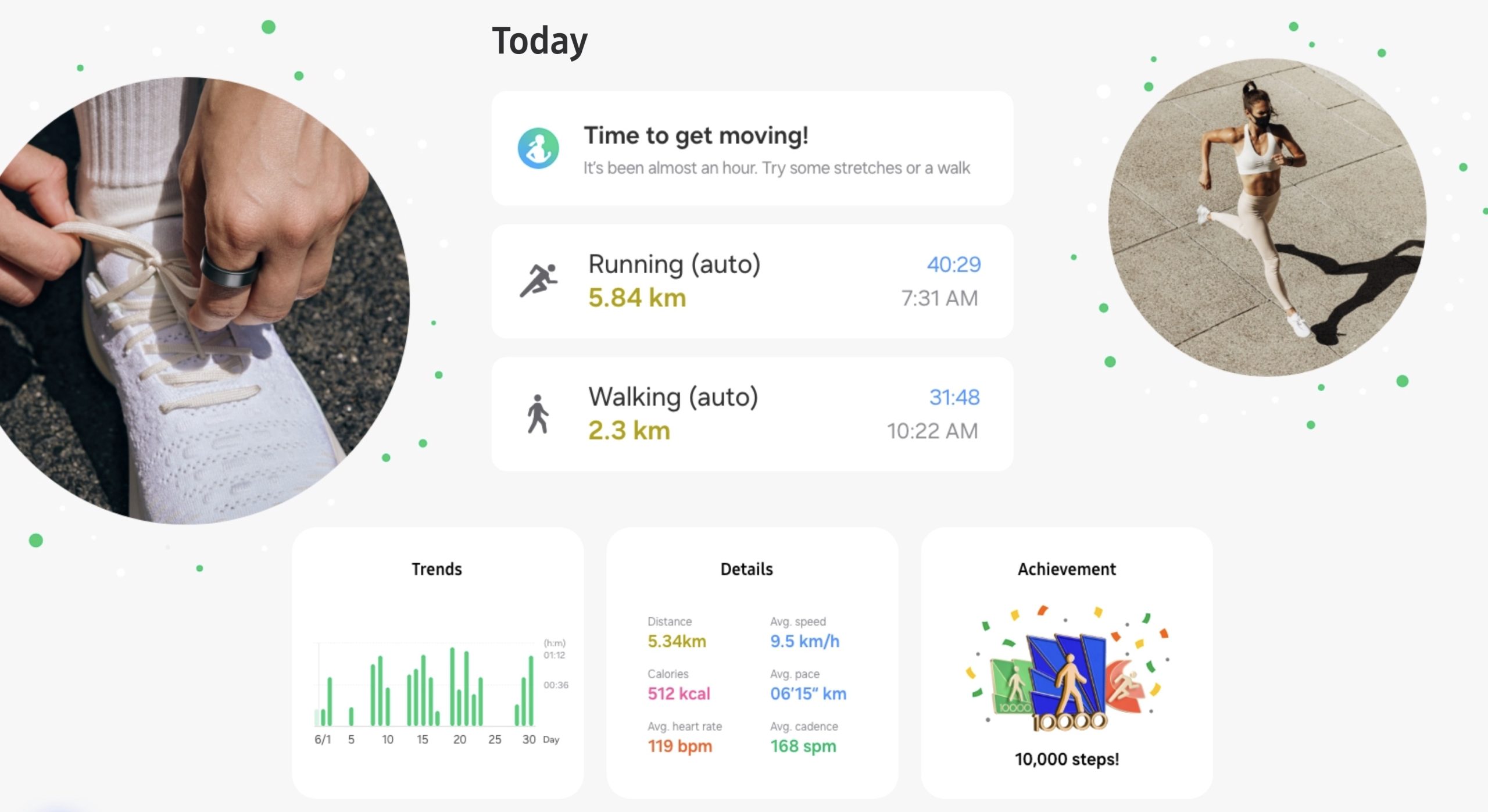 - เมื่อติดตามและตรวจวัดด้วยเซ็นเซอร์แล้ว ข้อมูลสุขภาพเชิงลึกจะรายงานบนโทรศัพท์ที่เชื่อมต่อกับแหวน Galaxy Ring ผ่านแอป Samsung Health ซึ่งให้ข้อมูลอย่างละเอียด ไม่ว่าจะเป็น การเดิน การวิ่ง การนอนหลับ อัตราการเต้นของหัวใจ