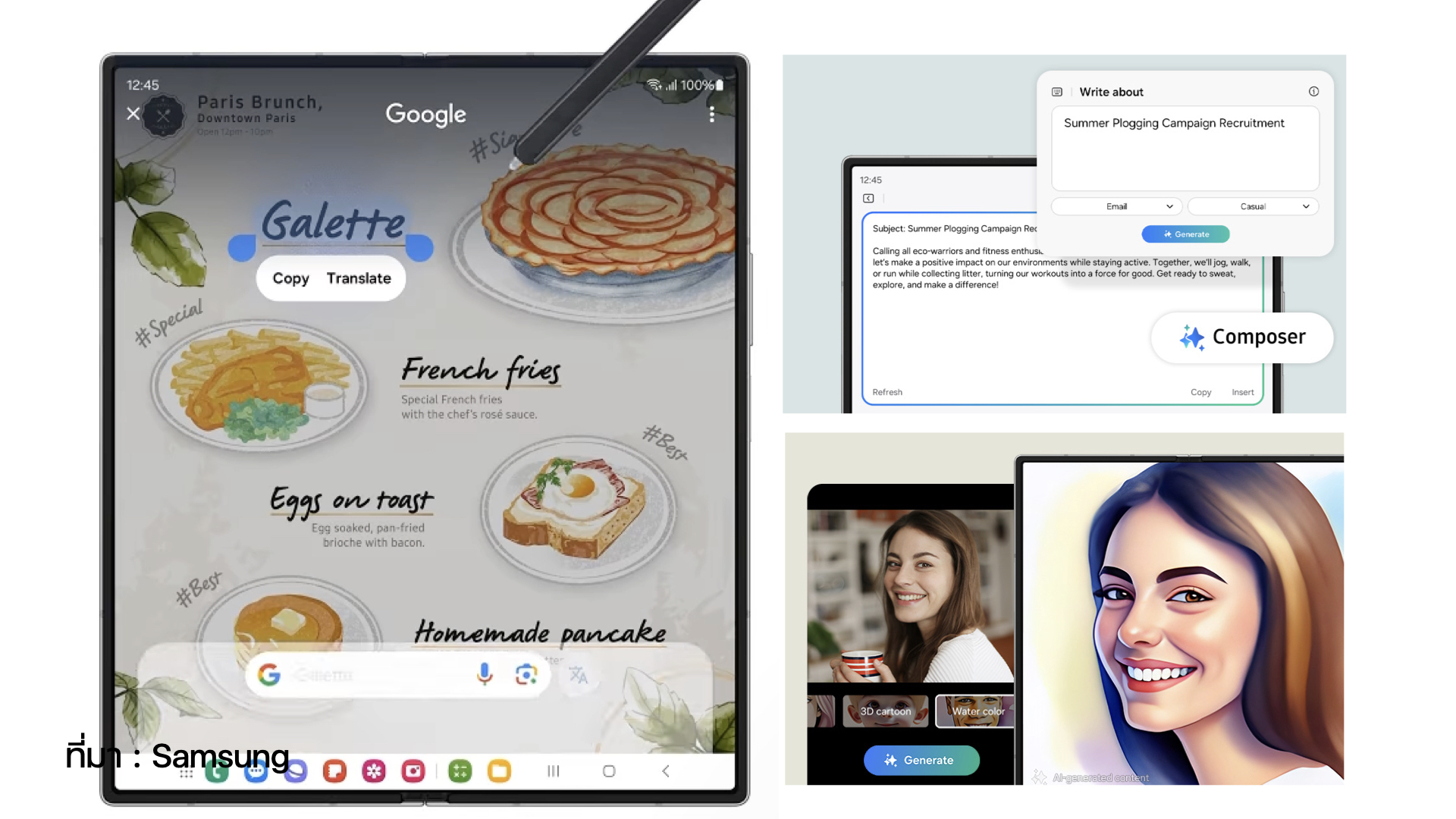 - Galaxy AI ฟีเจอร์เด่นของ Samsung ก็มาอยู่บน Galaxy Z Fold6 เช่นกัน โดยมีฟีเจอร์เด่น ๆ ดังนี้