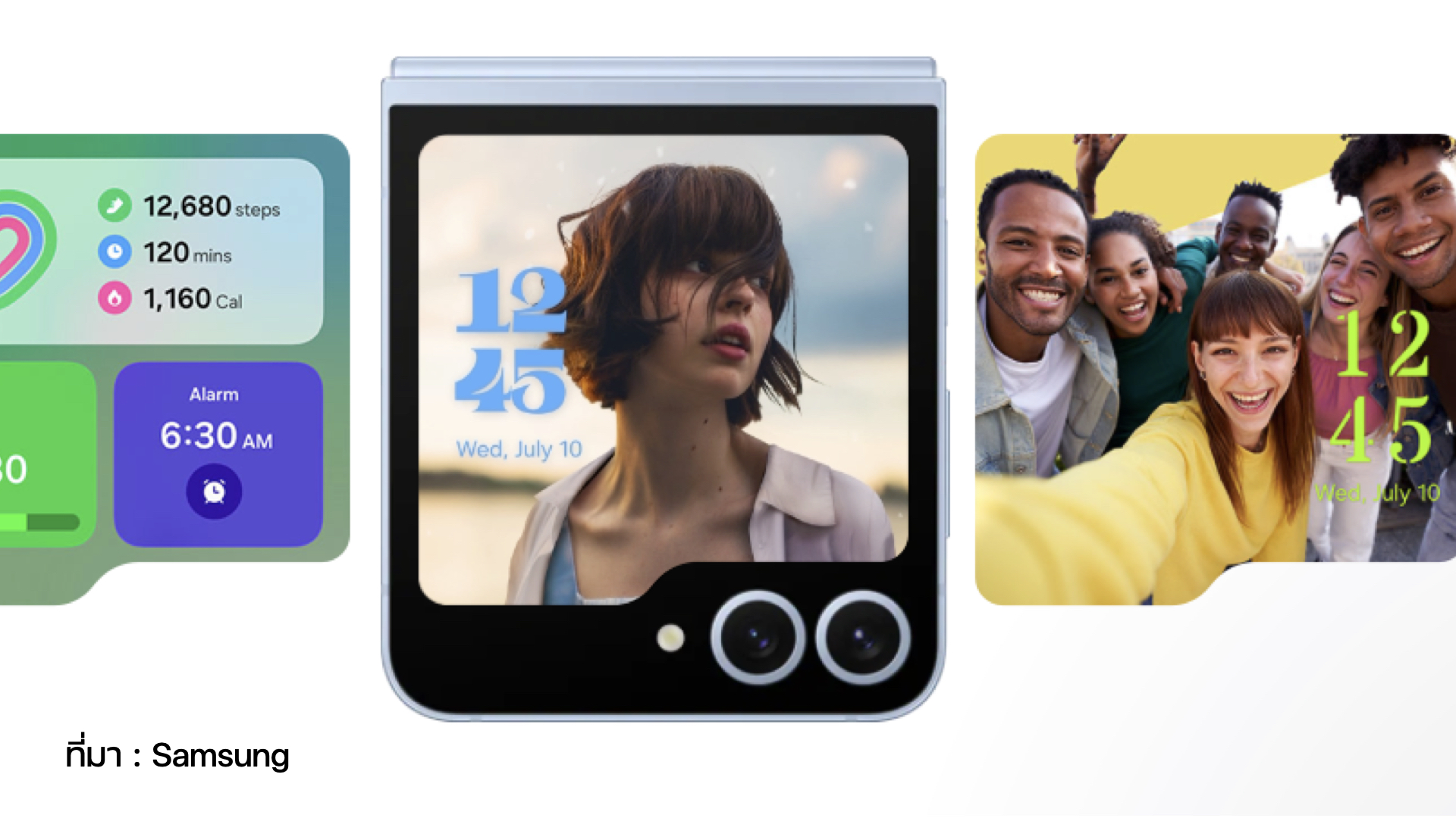 หน้าจอด้านนอกของ Galaxy Z Flip6 เป็นหน้าจอขนาด 3.4″ ที่ผู้ใช้สามารถใช้ประโยชน์ในการเปลี่ยนรูปแบบของจอนอก ให้เป็นไปตามรูปแบบที่ต้องการได้