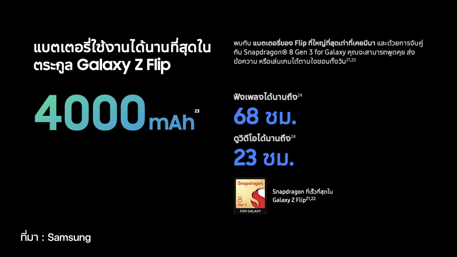 Galaxy Z Flip6 มาพร้อมแบตเตอรี่ความจุ 4,000 mAh มากสุดในตระกูล Z Flip โดย Samsung เคลมว่า Galaxy Z Flip6 สามารถใช้ฟังเพลงต่อเนื่องได้ 68 ชม. และดูวิดีโอได้นานสุด 23 ชม.