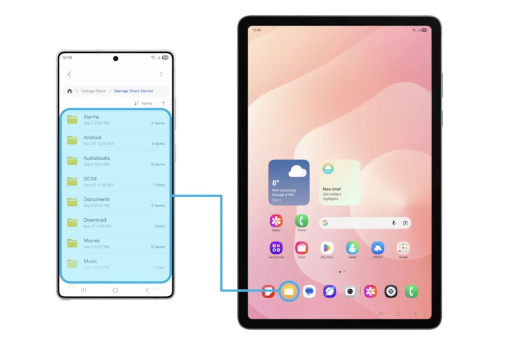Storage Share มอบความลื่นไหลมากขึ้นให้กับระบบนิเวศ Galaxy โดยแสดงไฟล์จากอุปกรณ์ Galaxy อื่น ๆ รวมถึงแท็บเล็ตและพีซี ให้ดูได้โดยตรงในแอป My Files และยังอนุญาตให้เข้าถึงไฟล์ในสมาร์ตโฟนจากอุปกรณ์ Samsung อื่นได้ เช่น ทีวี