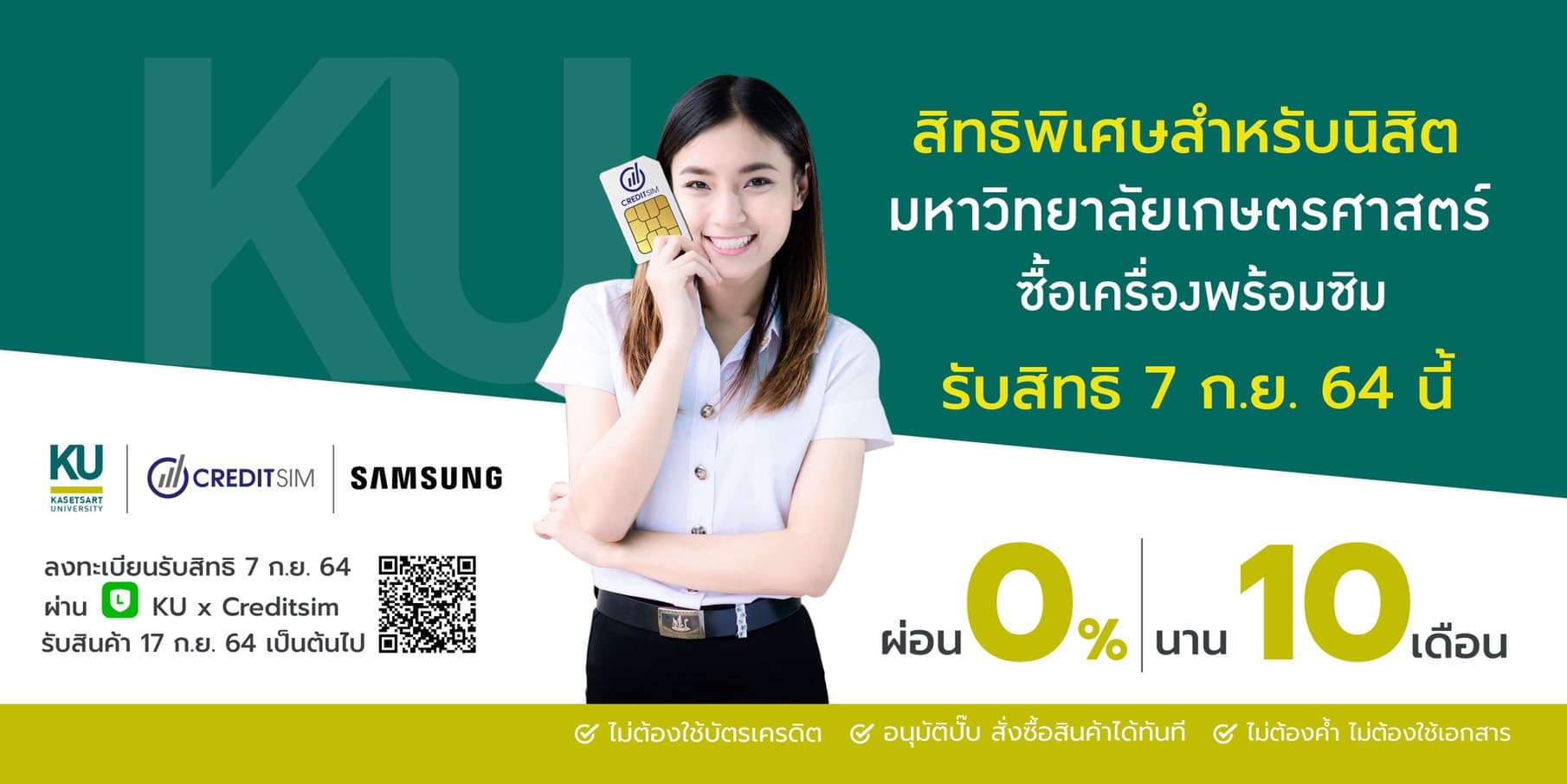 นิสิตและบุคลากรมหาวิทยาลัยเกษตรศาสตร์ สามารถเป็นเจ้าของสมาร์ทโฟนและแท็บเล็ตใหม่สุดล้ำจากแบรนด์ซัมซุงได้ง่าย ๆ เพียงแค่ใช้ซิมการ์ดเลขหมายโทรศัพท์และแพ็กเกจมือถือของ Credit Sim ที่ “คุ้มทั้งโทร ทั้งเน็ต” รับสิทธิ์โทรฟรีได้ 24 ชั่วโมง อินเทอร์เน็ตไม่อั้น ความเร็วพุ่งปรี๊ด มีให้เลือกครบทุกค่าย ราคาเริ่มต้นเพียง 222 บาทต่อเดือน