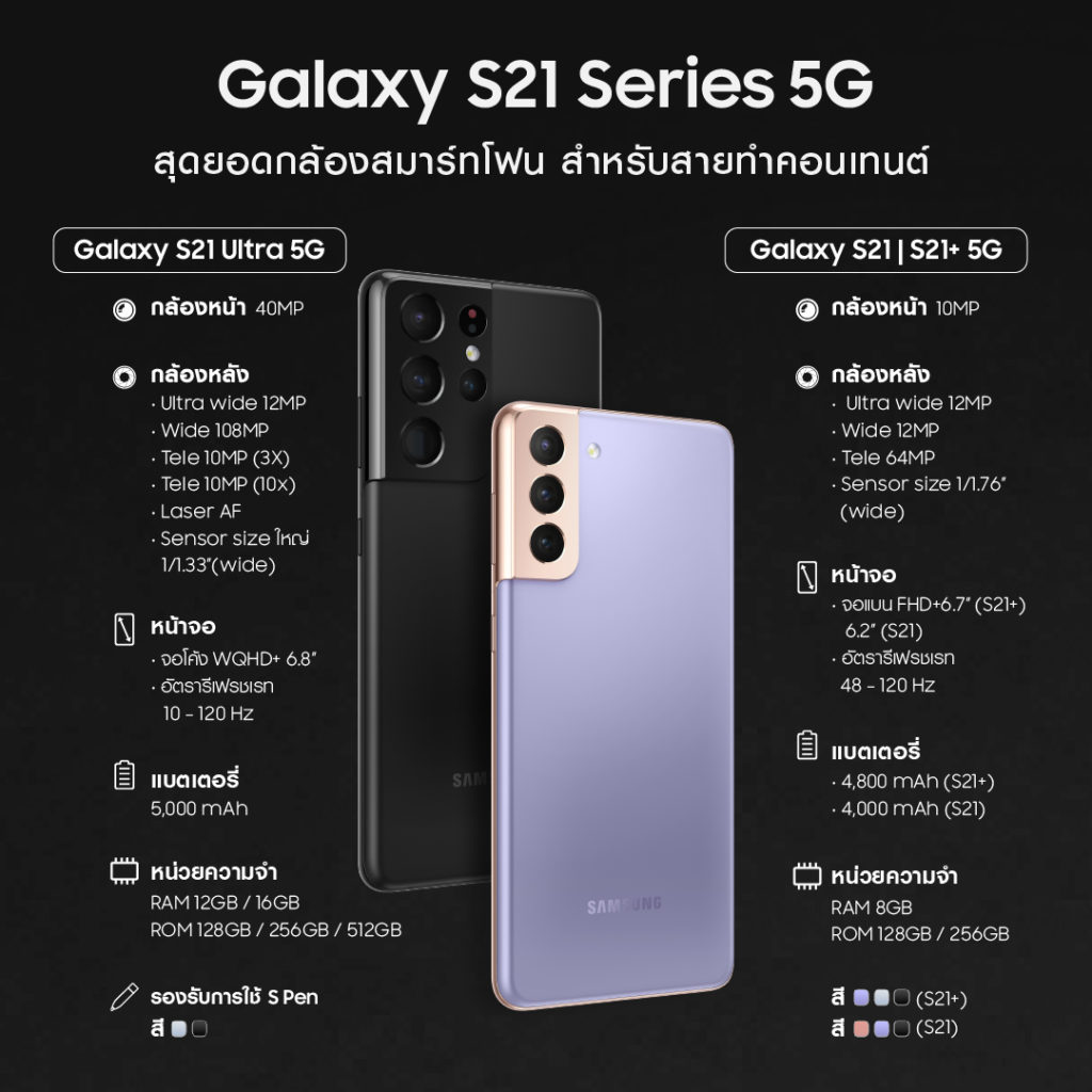 เปิดตัวพร้อมเผยโฉมสมาร์ตโฟนเรือธงในตะกูล Galaxy S21 กันมาแล้ว มาพร้อมกันถึง 3 รุ่นด้วยกัน ได้แก่ Galaxy S21, S21 และพี่ใหญ่ S21 Ultra ทั้งหมดมาพร้อมการรองรับระบบ 5G ความเร็วสูง ไฮไลท์ในครั้งนี้ก็จะเป็นเรื่องของกล้องที่ถ่ายสวยคมชัดระดับโปร และชิปประมวลผลใหม่ที่ทำงานได้อย่างมีประสิทธิภาพ ซึ่งรุ่น S21 Ultra รองรับ SPen ด้วย