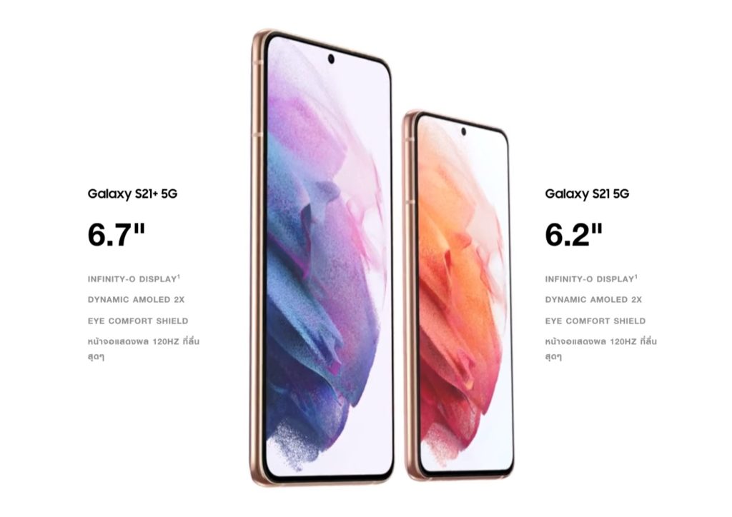 Galaxy S21 มาพร้อมหน้าจอ ขนาด 6.2 นิ้ว, รุ่น S21+ มีหน้าจอขนาด 6.7 นิ้ว ส่วนรุ่น S21 Ultra มีหน้าจอขนาด 6.8 นิ้ว รองรับการแสดงผล 120Hz ทุกรุ่น เป็นหน้าจอ Dynamic AMOLED 2X ที่สว่างสดใสและไหลลื่น และยังมาพร้อมเทคโนโลยี Eye Comfort Shield ที่ช่วยให้ผู้ใช้รับชมเนื้อหาได้อย่างสบายตา ลดความเมื่อยล้าได้