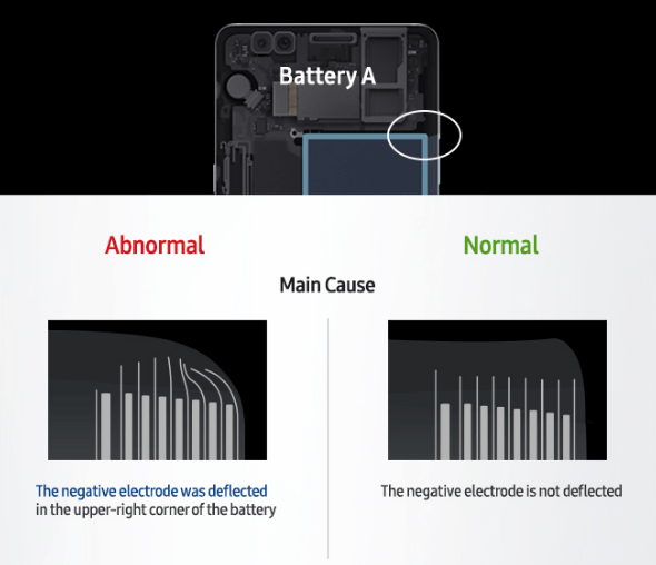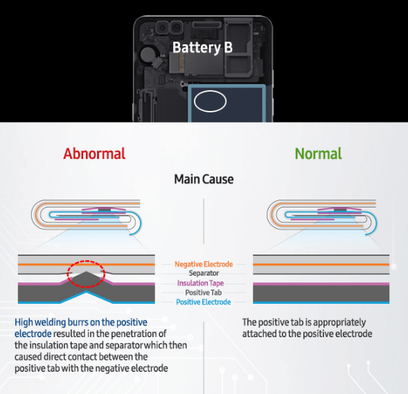ปัญหาของทั้ง 2 ล็อตแตกต่างกันที่ Battery A จะเป็นปัญหาการสัมผัสกันระหว่างขั้วบวก (+) และขั้วลบ (-) ที่มุมบนขวาของแบตเตอรี่ ส่วน Battery B เป็นปัญหาในส่วนของตัวแบตเตอรี่ที่ตั้วกั้นถูกดันตัวขึ้นทำให้ขั้วบวก (+) และขั้วลบ (-) สัมผัสกัน