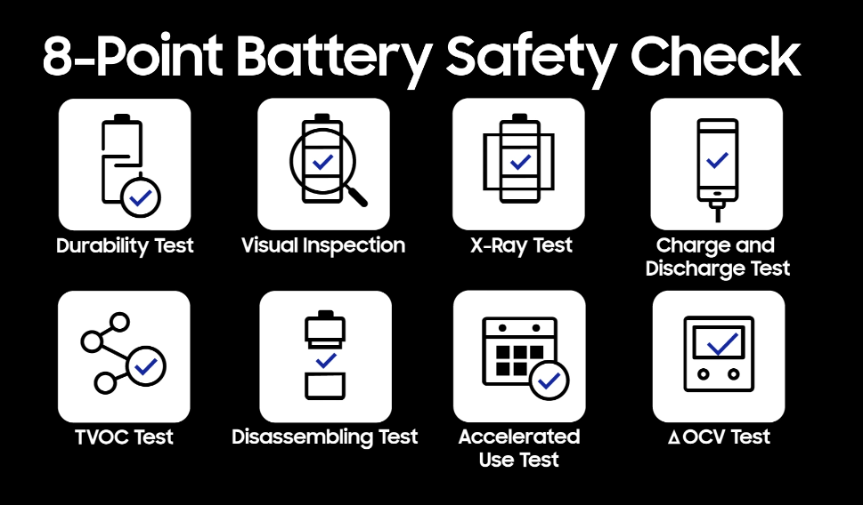 ทั้งนี้ทาง Samsung ได้เผยถึงมาตรการในการตรวจสอบความปลอดภัยที่เรียกว่า Multi-layer safety measures และ 8-Point Battery Safety Check เพื่อเพิ่มขั้นตอนการทดสอบ ตรวจสอบคุณภาพ