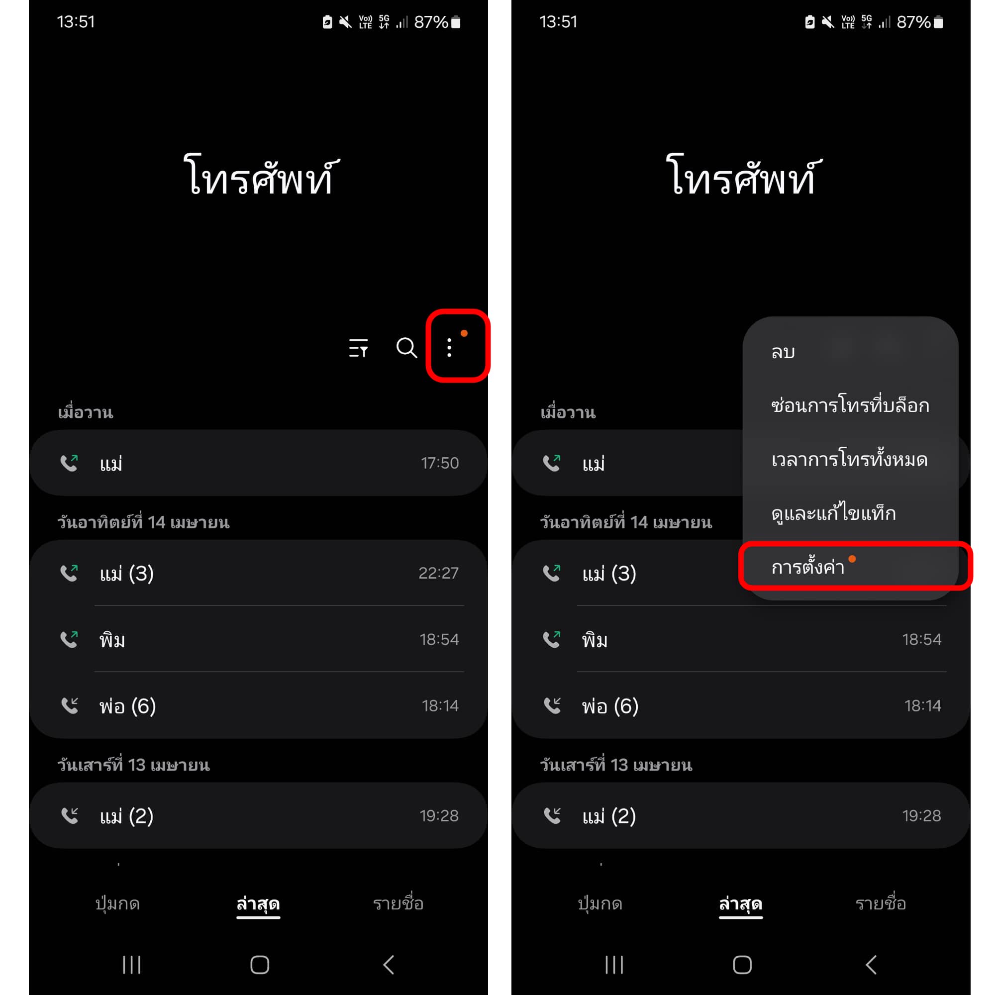 ให้เราเข้าที่แอปโทรศัพท์จากนั้นกด จุดสามสุด > การตั้งค่า