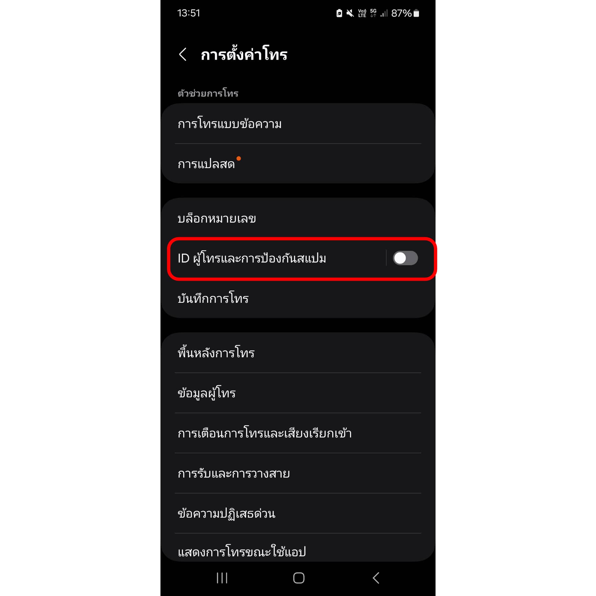 จากนั้นให้กด “เปิด” แล้วกด “บล็อกการโทรสแปมจากมิจฉาชีพ” โดยที่เราสามารถเลือกได้ว่าจะ “บล็อกการโทรสแปมและการโทรจากมิจฉาชีพทั้งหมด” หรือ “บล็อกการโทรจากมิจฉาชีพที่มีความเสี่ยงสูงเท่านั้นก็ได้”