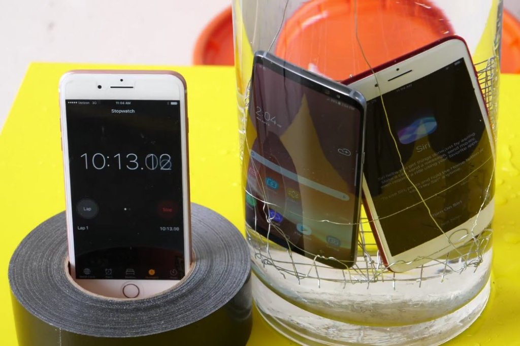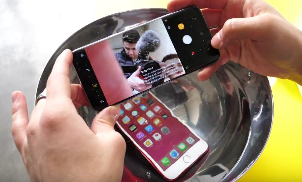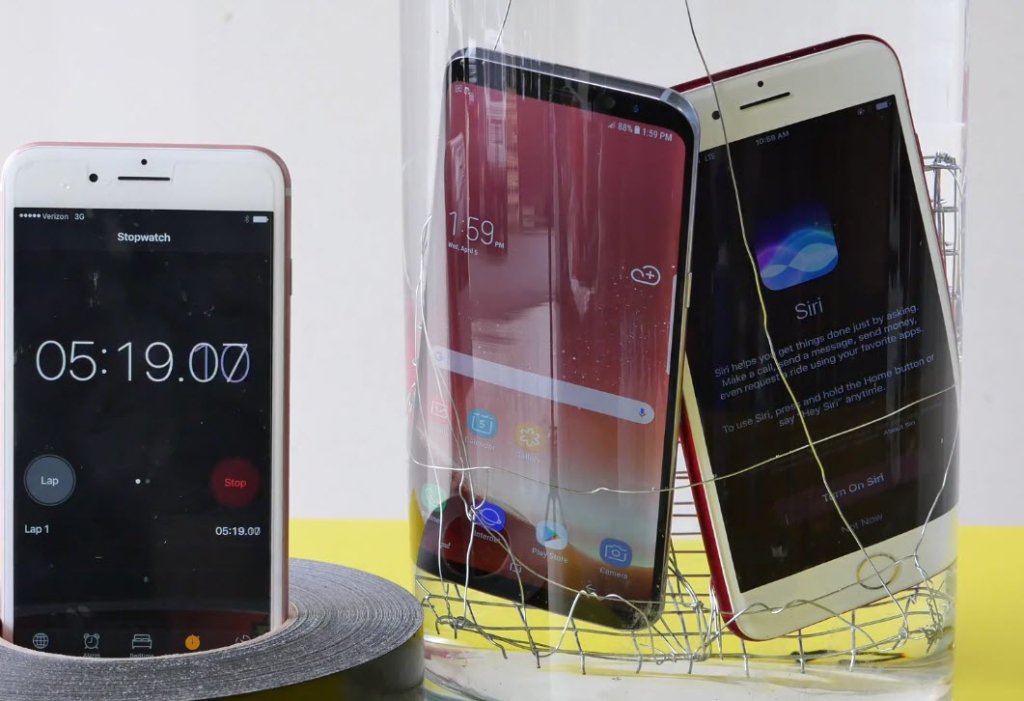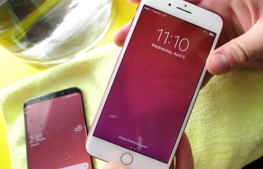เริ่มแรกผู้ทดสอบทำการแช่ Samsung Galaxy S8+ และ iPhone 7 Plus RED ไว้ในอ่างน้ำ โดยรวม Smartphone ทั้งสองรุ่นก็ทำงานได้ปกติไม่มีปัญหาอะไร