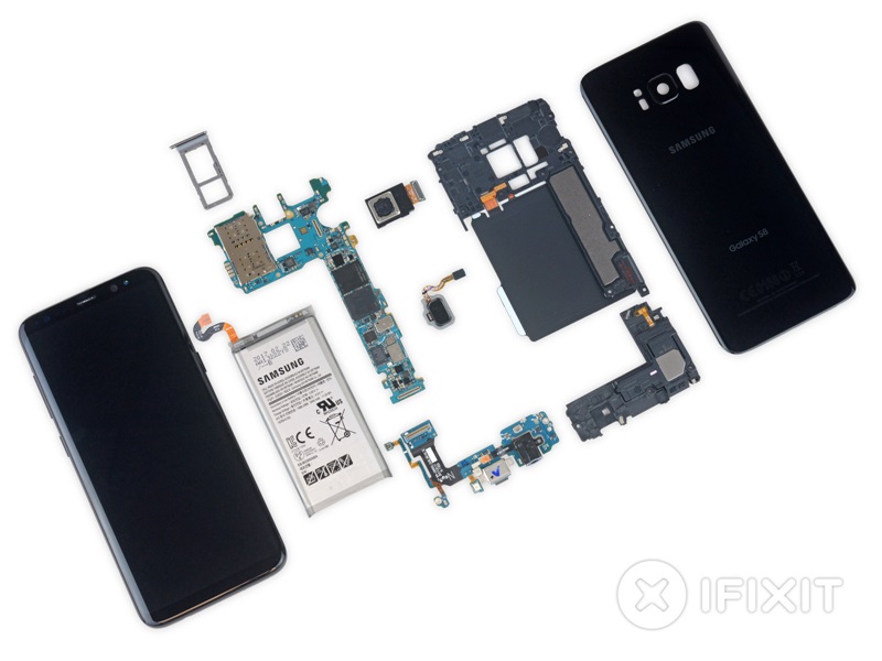 iFixit ได้ตั้งข้อสังเกตเกี่ยวกับกระจกโค้ง ถูกซีลไว้ด้วยกาวที่แข็งแรงทำให้ Galaxy S8 ค่อนข้างที่จะเปิดได้ยาก และในขณะที่ชิ้นส่วนภายในสามารถถอดแกะได้อย่างอิสระ เว้นเสียแต่ว่าแบตเตอรี่ที่ค่อนข้างจะยากหน่อย
